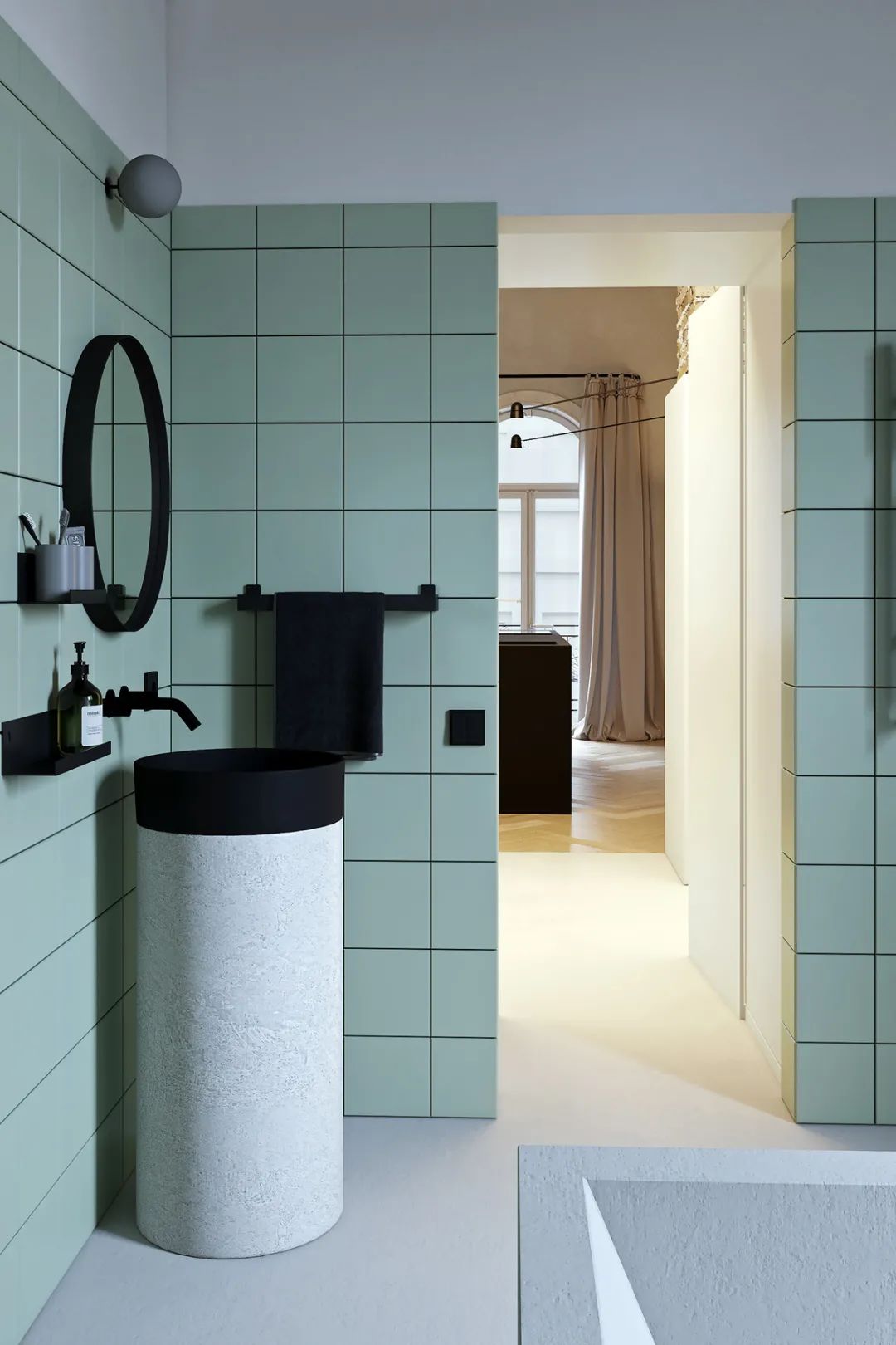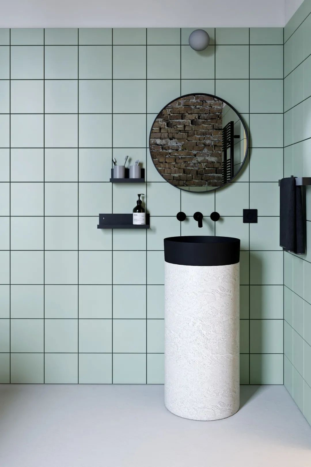 半墙的水绿色瓷砖,搭配简约的黑白卫浴产品,十分干净清爽。