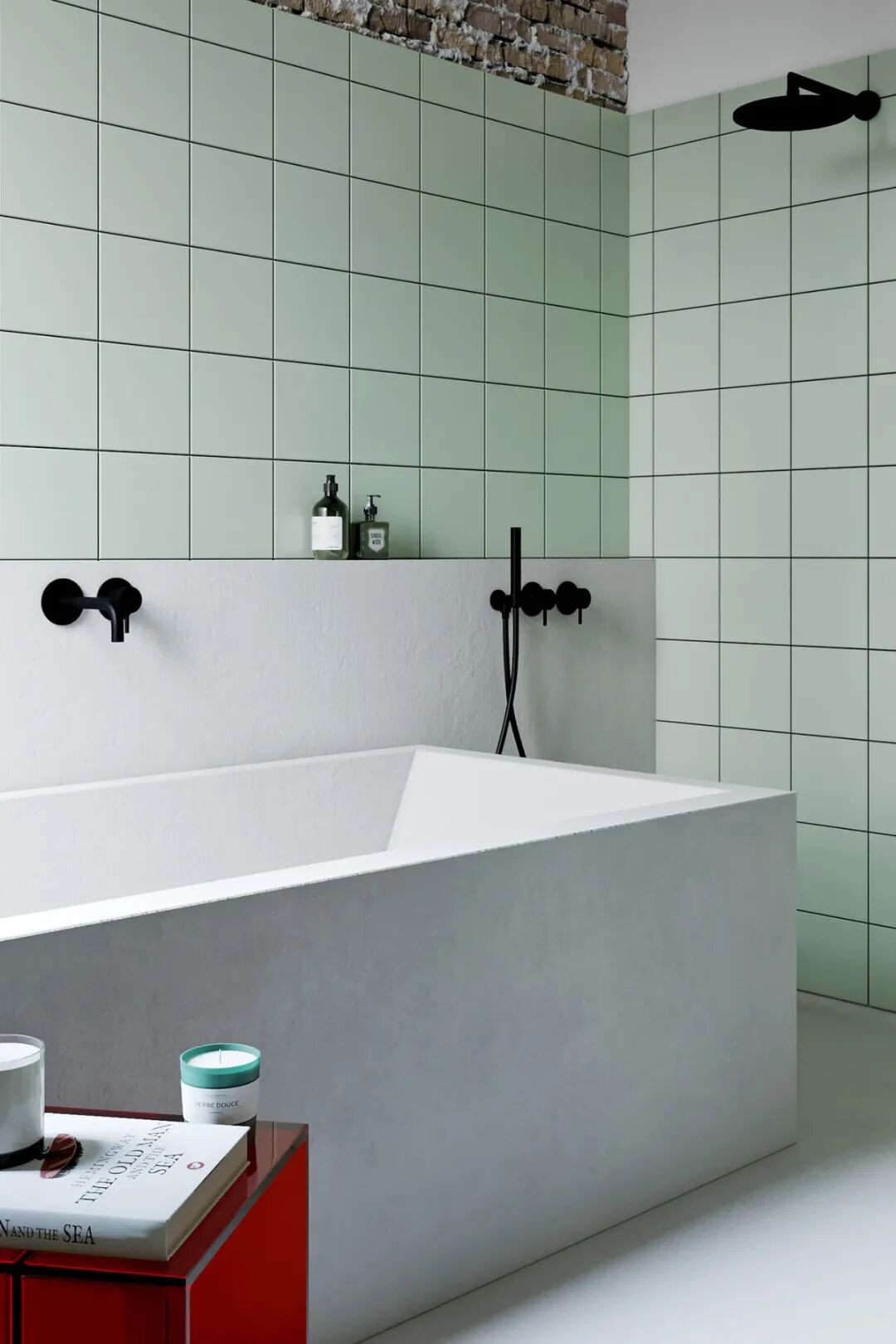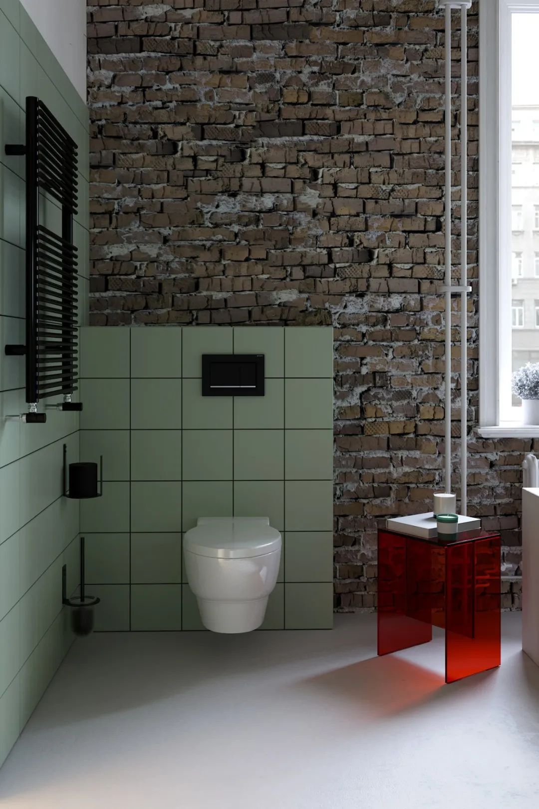 卫生间内也保留了一部分砖墙,旁边还有红色的亚克力边桌,历史与现代的碰撞在这里体现的淋漓尽致。