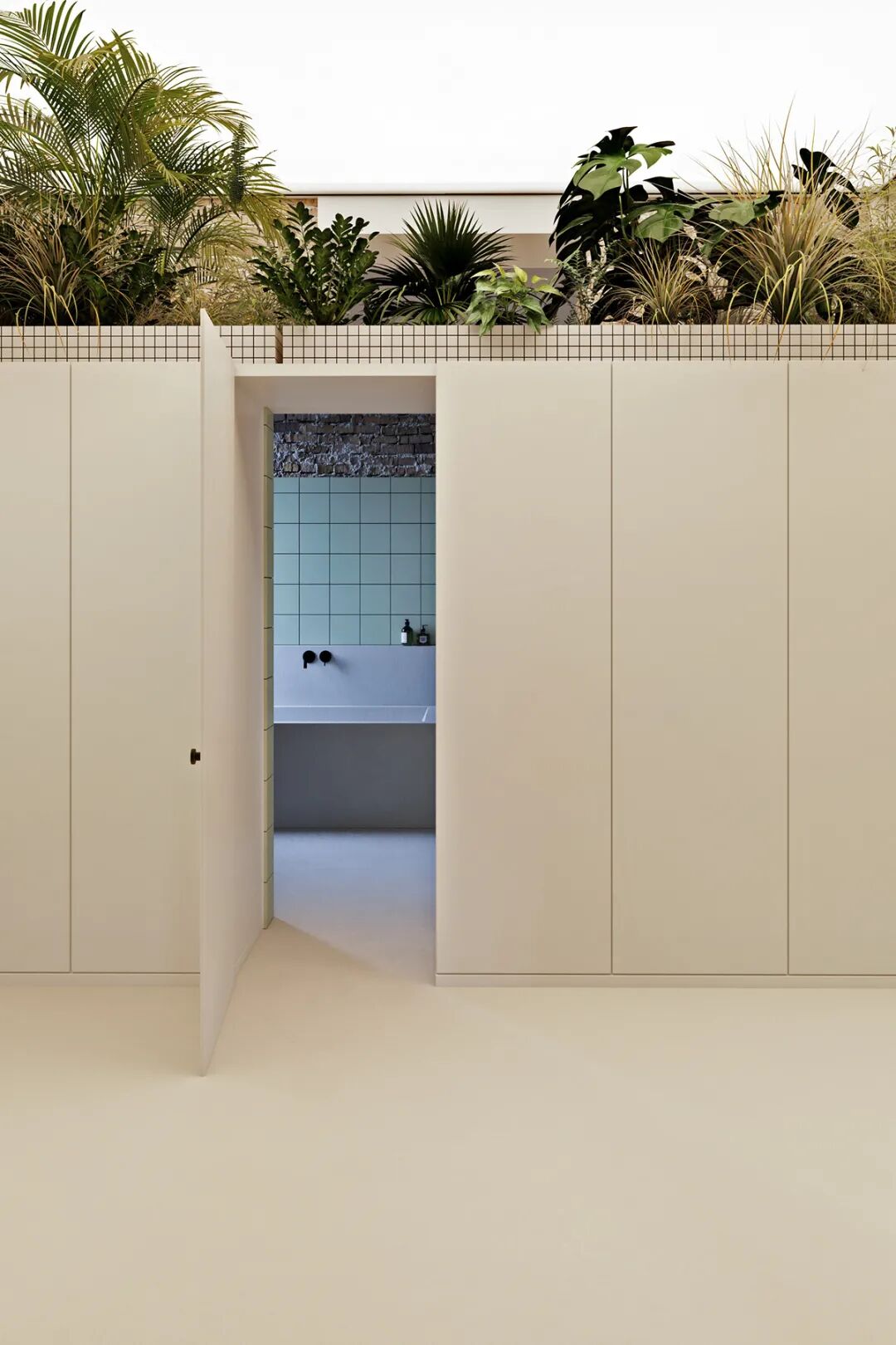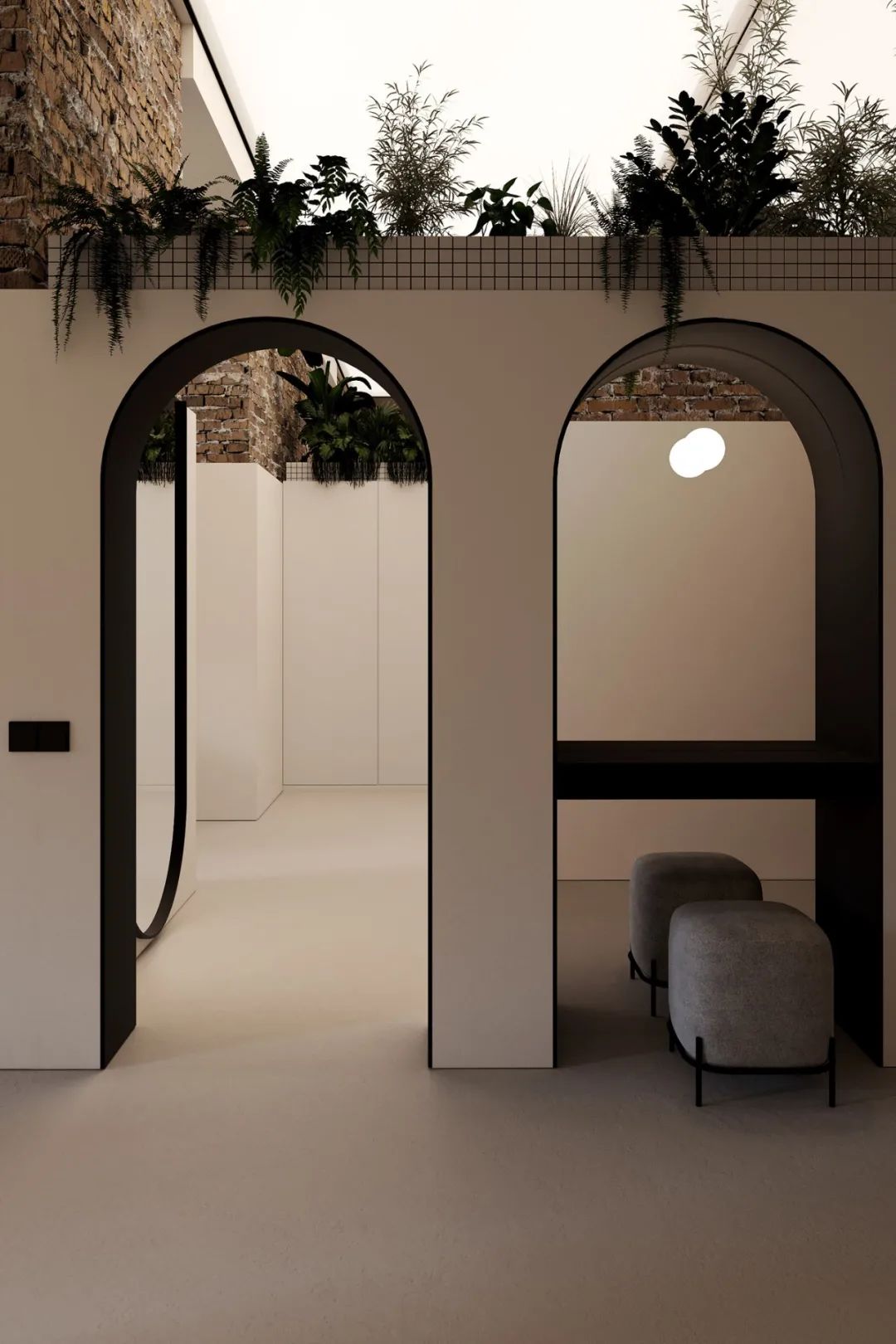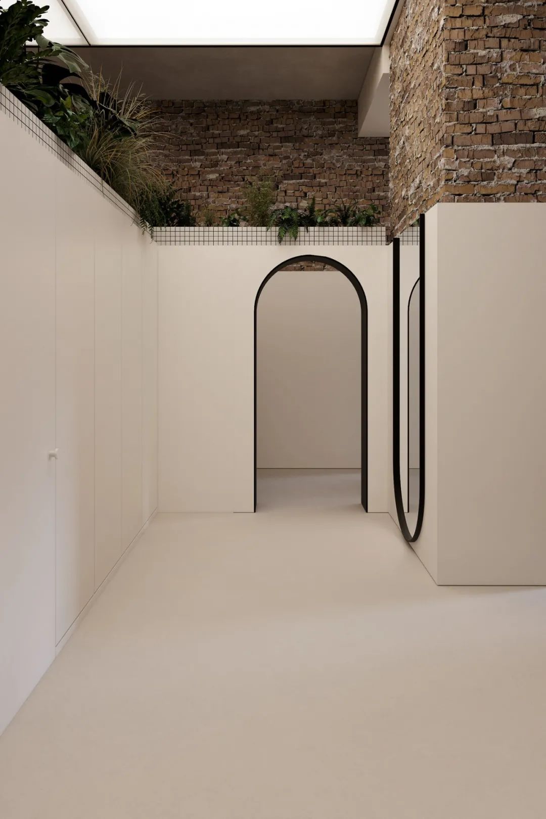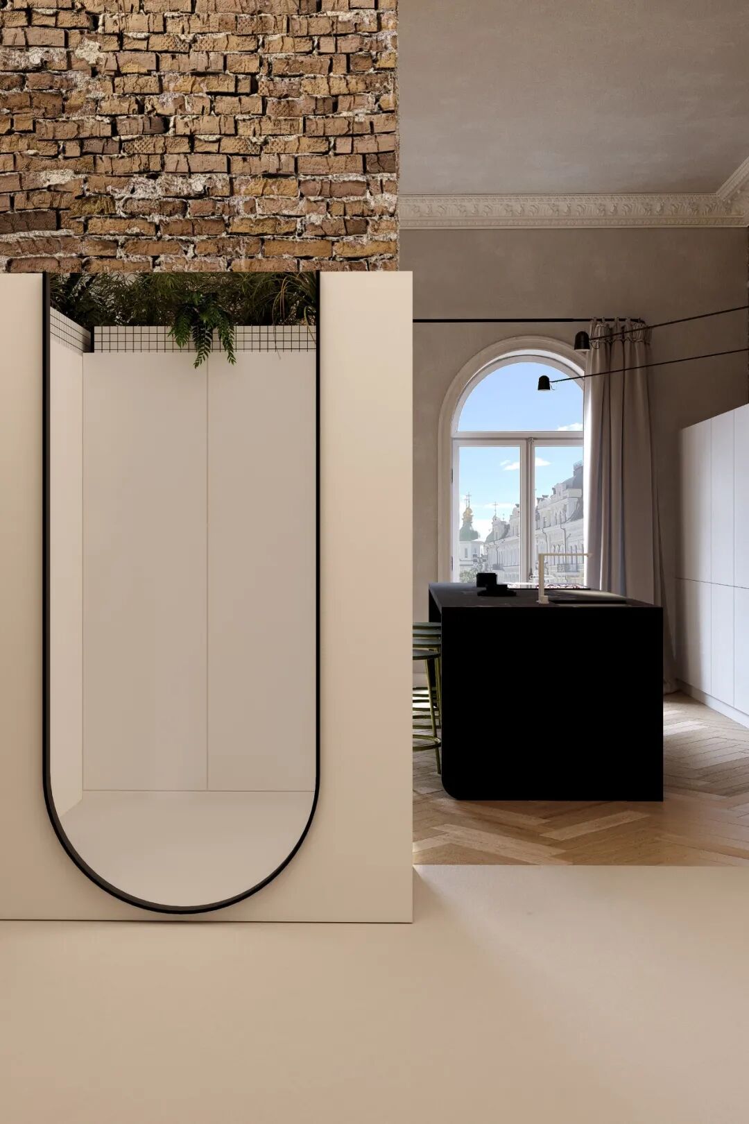 拱门的形状与窗户形成呼应,衣帽间的隔断墙并没有延伸到天花板,留出的空间摆放了绿植,增添了整个区域的活力。