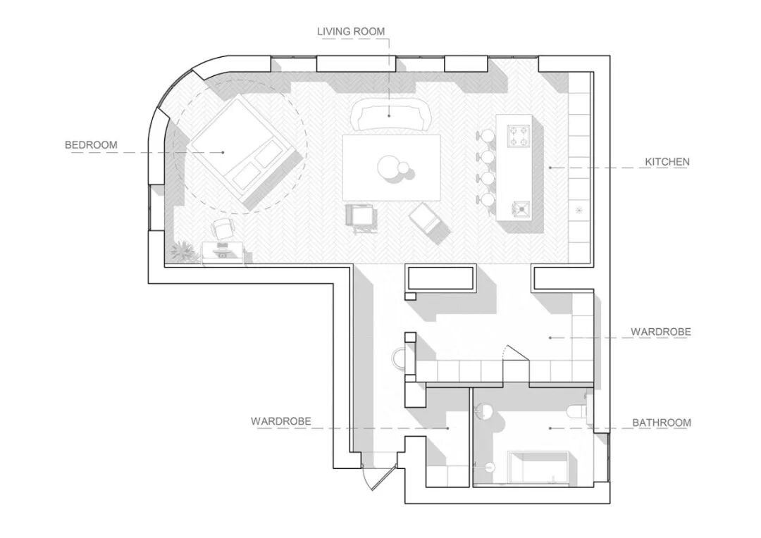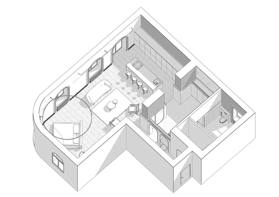 厨房、起居室、卧室在同一个空间内,衣柜与卫生间则被归到单独的一侧。