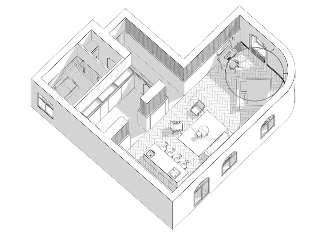 穿衣镜呈现出倒立的拱形,厨房可以直接通到这里,整体十分开阔。