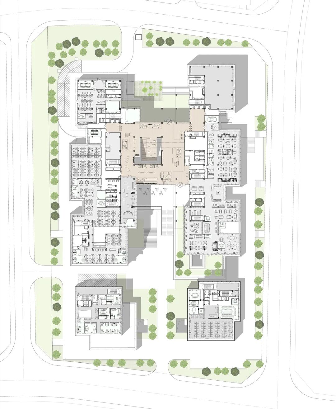 园区包含了开放空间及可以灵活使用的办公空间。还包含了高价值自然的多样生态环境。建筑都覆有轻质雨棚架构,各个空间可以有着充足的自然漫射光线和丰富的外部景观。