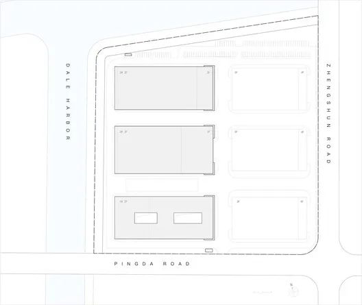 项目位于浙江省杭州市,设计以艺术中心前广场为核心,L型的公共轴勾勒出整座园区的骨架。水平轴线经公共街道延伸至园区的东入口,南北轴线则向南导入旧厂房中的集中式商业,串联起南部商业广场。