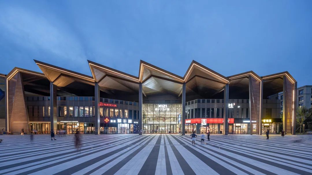 通过“裁切-翻折”的手法,建立锯齿状天窗体系;悬挑的金属折板成为具有标识性的雨棚,与方盒子商业体量脱开、形成对比。
