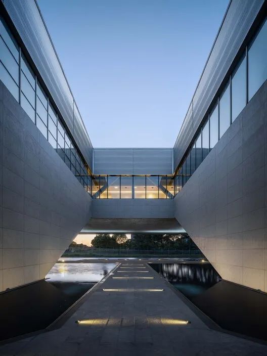 大面积镜面水池在超尺度悬挑建筑结合,入口处的设计去繁就简,只保留了一条浮于水面的丁字形步道。