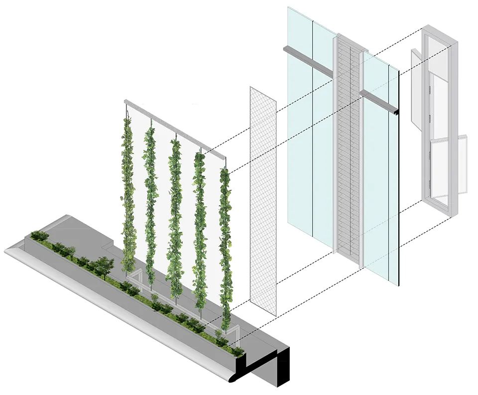 在垂直界面上,研发的双中空隔热三银玻璃幕墙,能最大化获取光照并阻隔太阳长波辐射热。幕墙外侧设计垂直绿化系统,形成了随季节生长变化的第二道动态植物界面。