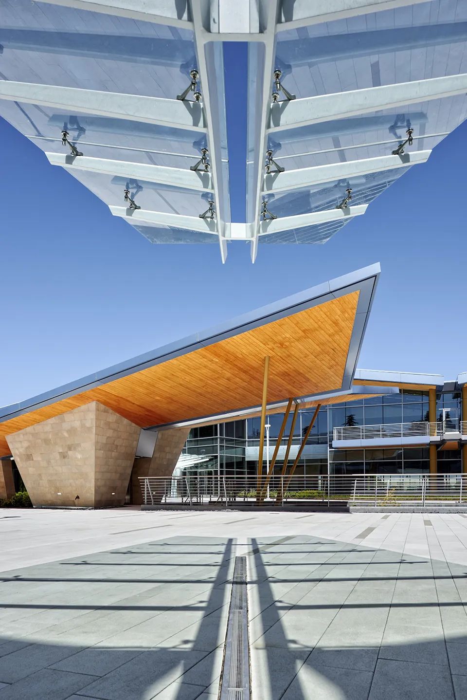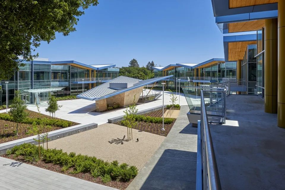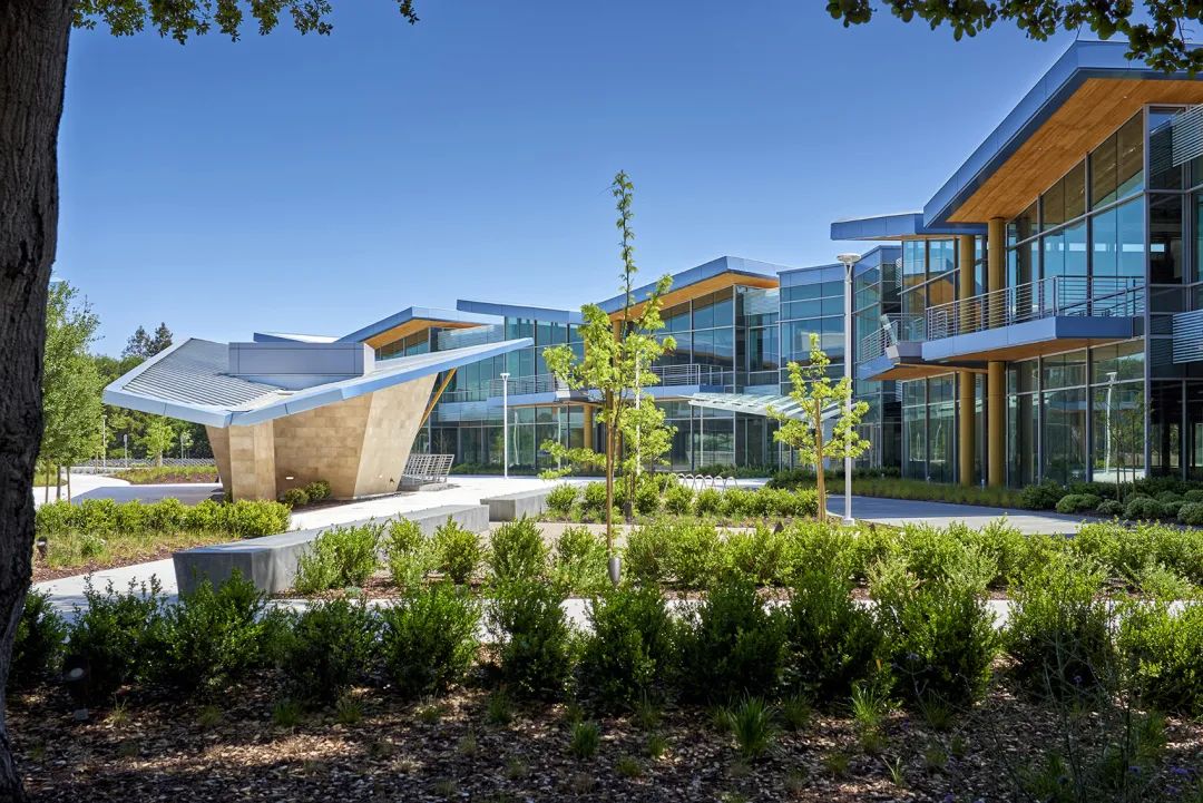 项目位于加州帕洛阿尔托的技术中心,整体外观以及行人尺度展现了现代主义的人文形式。折叠结构增添了双层建筑外部的质感和视觉趣味,倾斜屋顶将建筑体量破解为连贯的单元,当单元编织在一起时,建筑群显得丰富多样。
