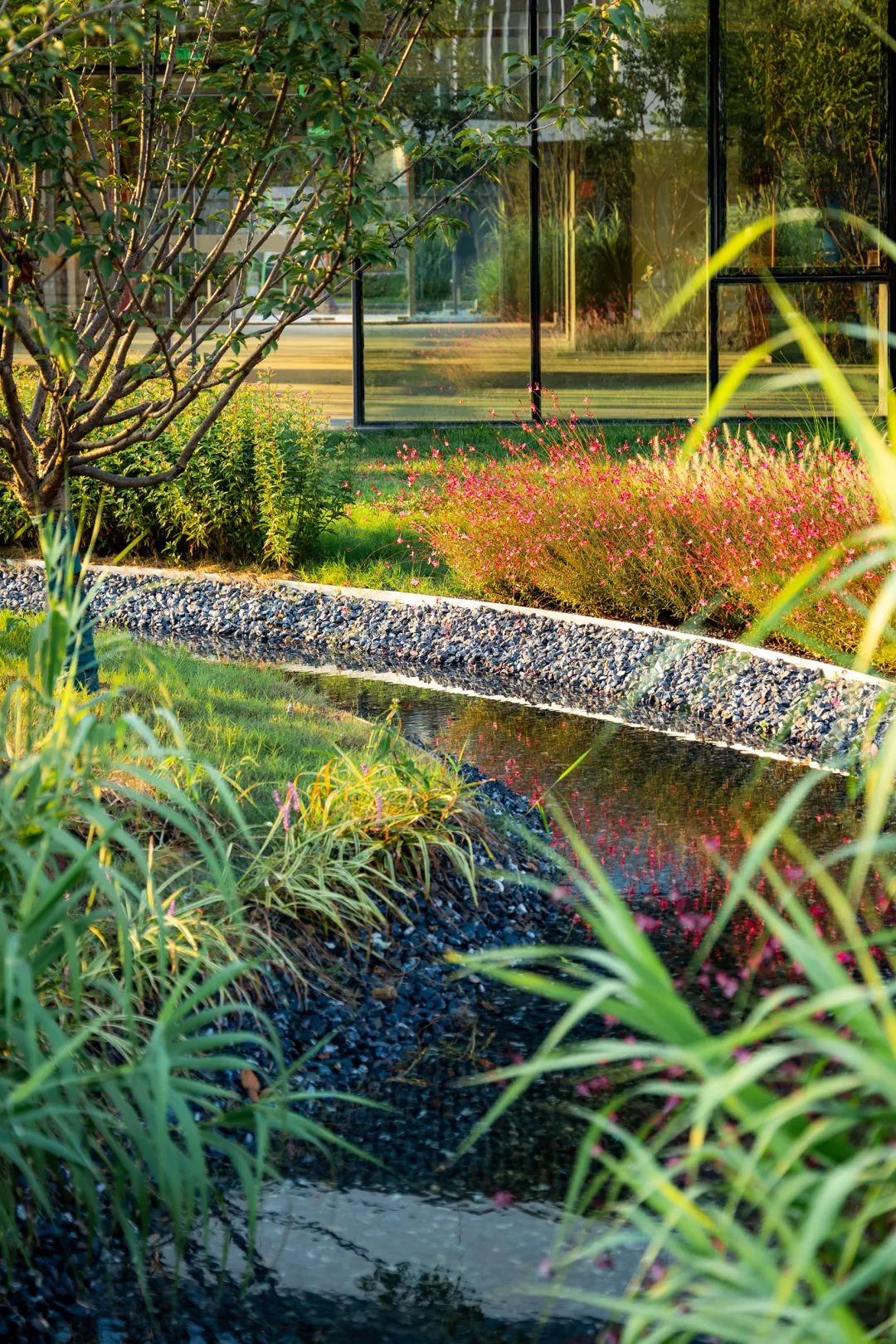 注重雨洪设施的景观化处理,通过小范围的水系和多样植物组合搭配,为鸟类、昆虫类等生物提供了水域环境,助力园区生境的复育,实现生态办公。