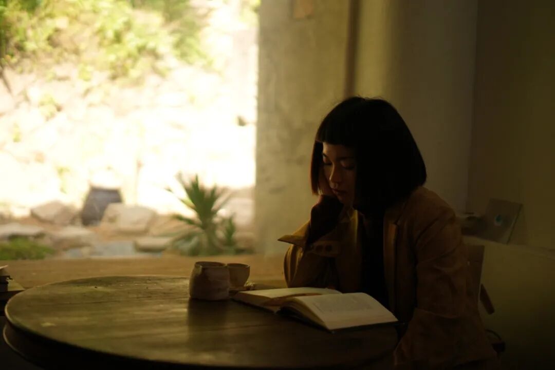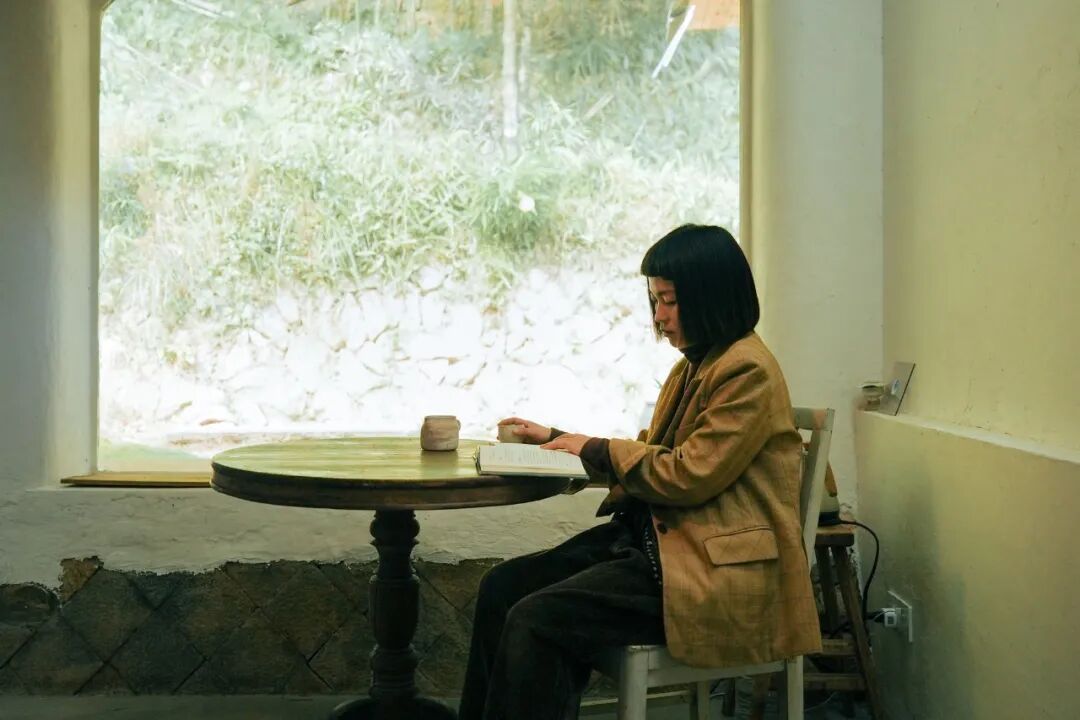 后山是个小坡,天气好的时候,她带着各色器皿直接爬上坡去喝茶和看书,两只猫咪有时候也会游荡过来,趴在她身边。