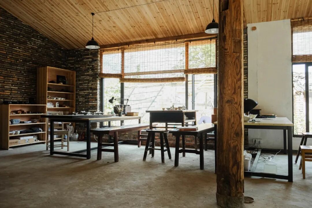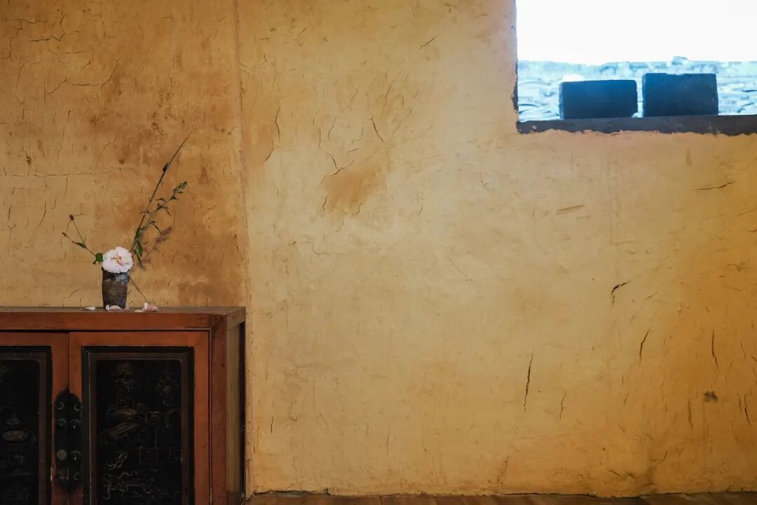 工作室的墙面斑驳古朴,也是雷禺和群生刻意保留的“野生”质感。墙面掉漆时,他们找了山里的泥和稻草来补,就是为了接近原生的样子。书柜是房东早年打的,放在这样的墙面前毫不违和。