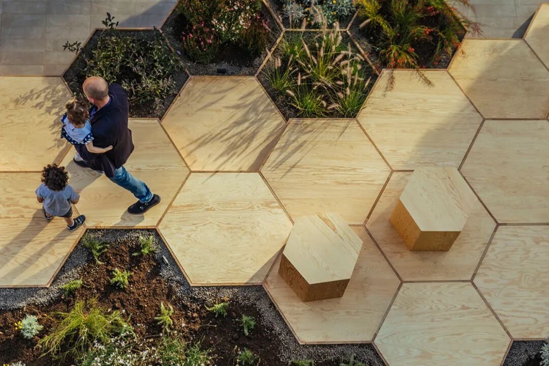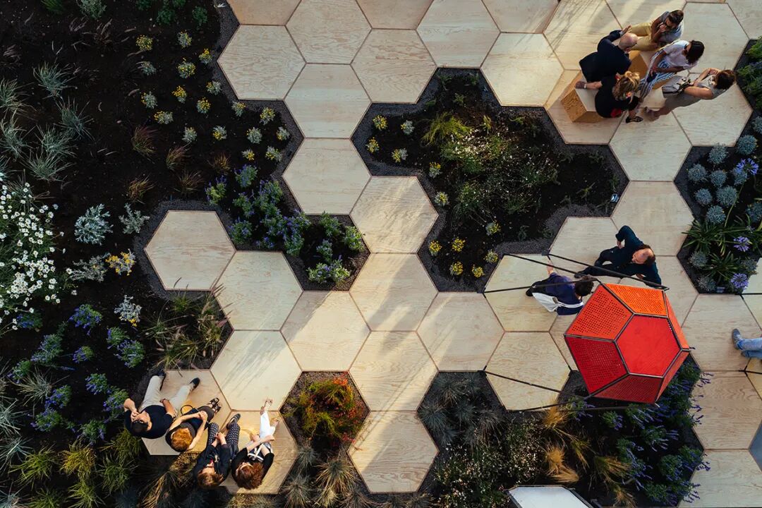该项目的设计灵感来自蜂巢,提取了六边形的元素。地面层由模块化的六边形胶合木板和种植池组成,而在垂直空间,红色的立体六边形作为灯具和扬声器均匀地分布在场地上。这些六边形的模块可以灵活组合,吸引行人的同时也丰富了城市景观。