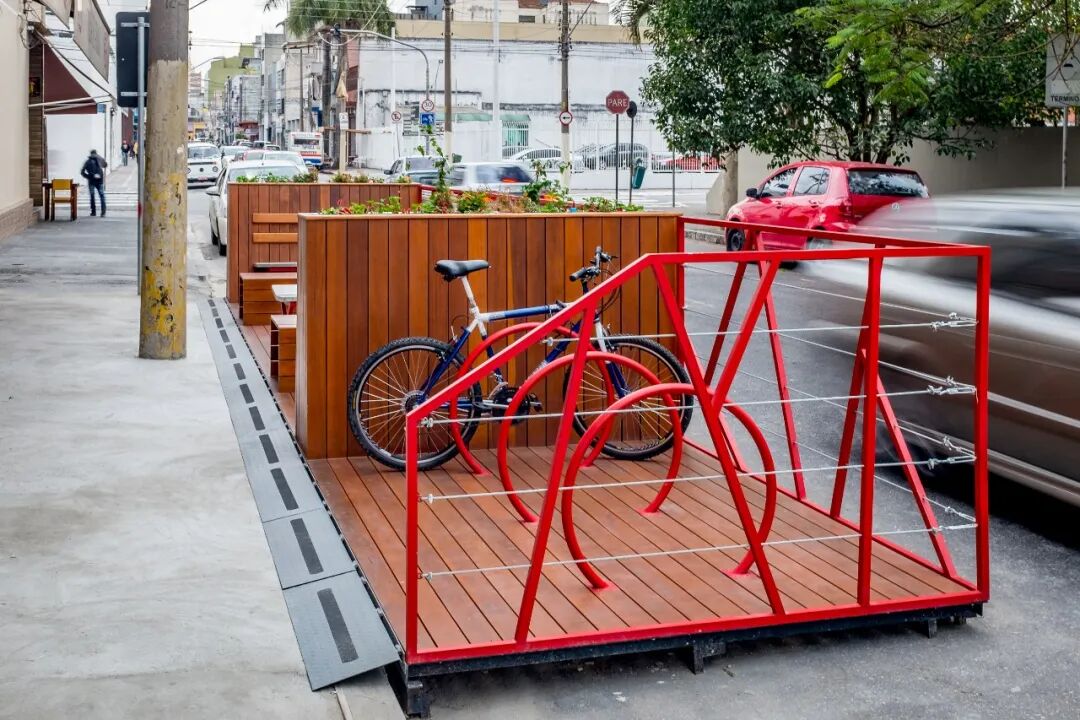 该项目是一个小型的口袋公园,作为人行道的延伸空间为行人提供休憩的场所,并促进交流,还可以停放三辆自行车,通过红色的钢制框架和网格分隔道路。