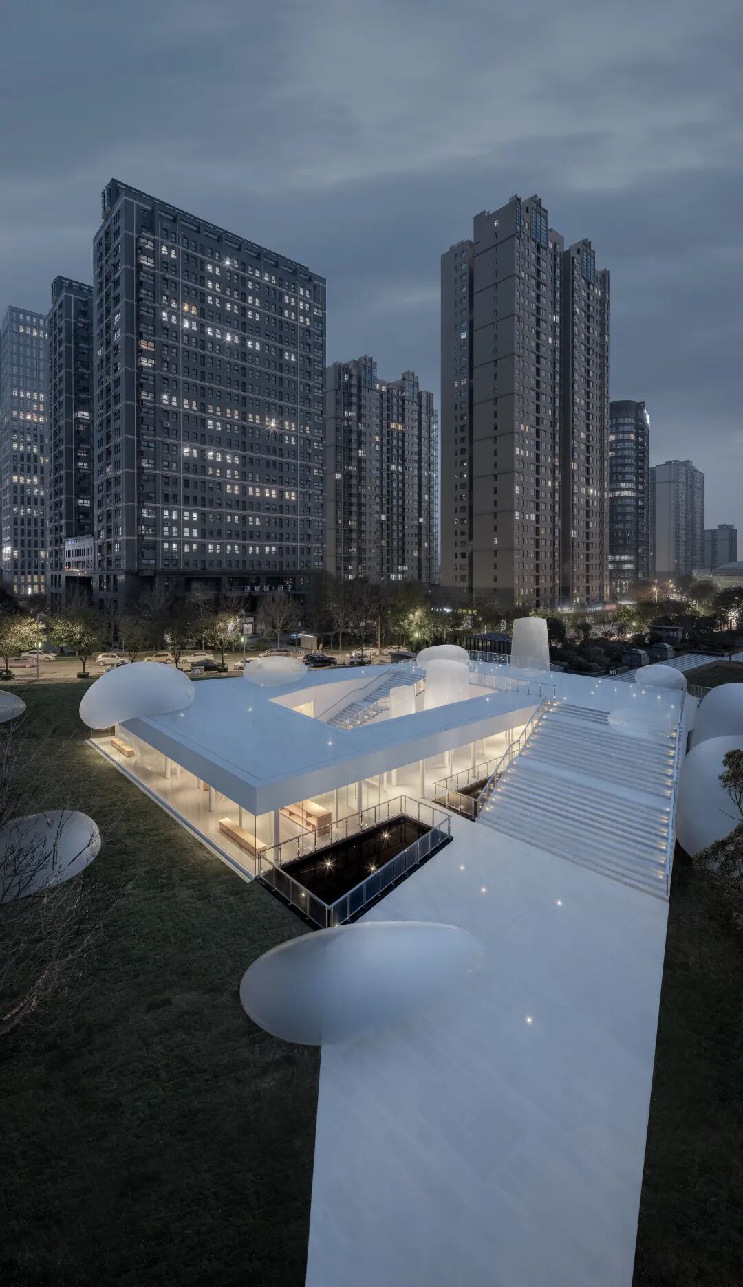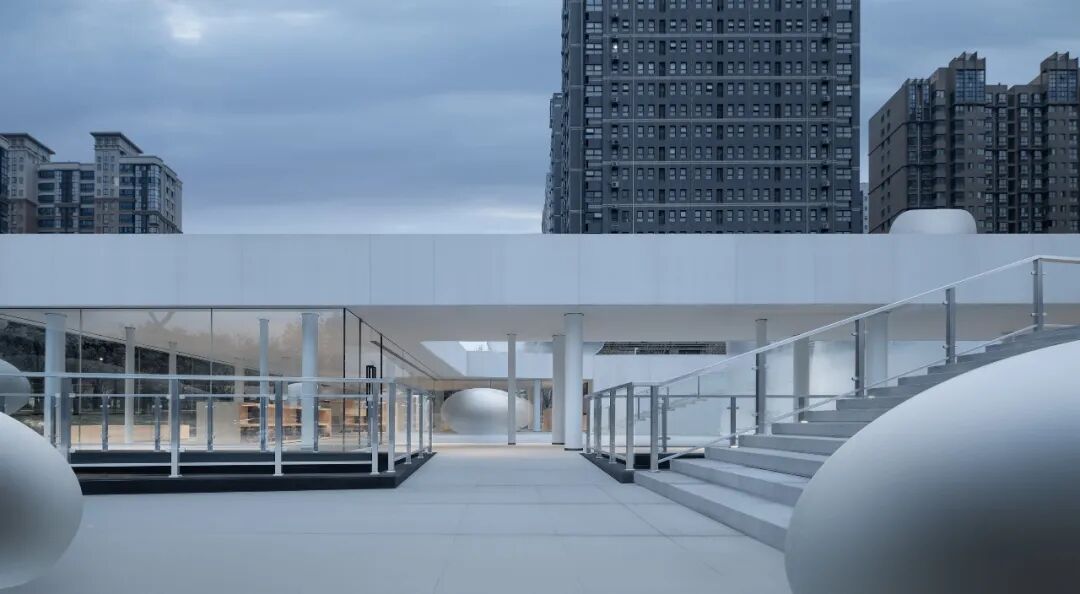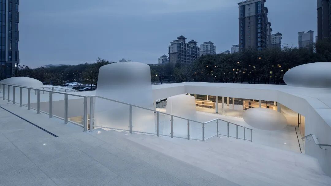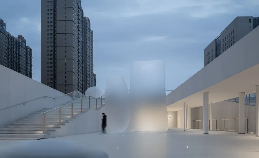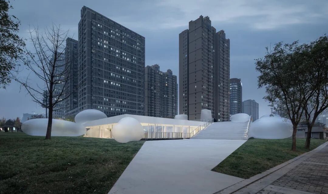 该项目位于中国西安,纯白的建筑在城市肌理中营造出一种超现实的氛围。15个半透明的“泡泡”装置形态各异,分别放置在屋顶平台、公共建筑内部和周围的草地上。它们没有功能,也不能互动,但并没有阻碍人行或视线,这种模糊的视线让人们以一种全新的视角来观察周围的城市景观。