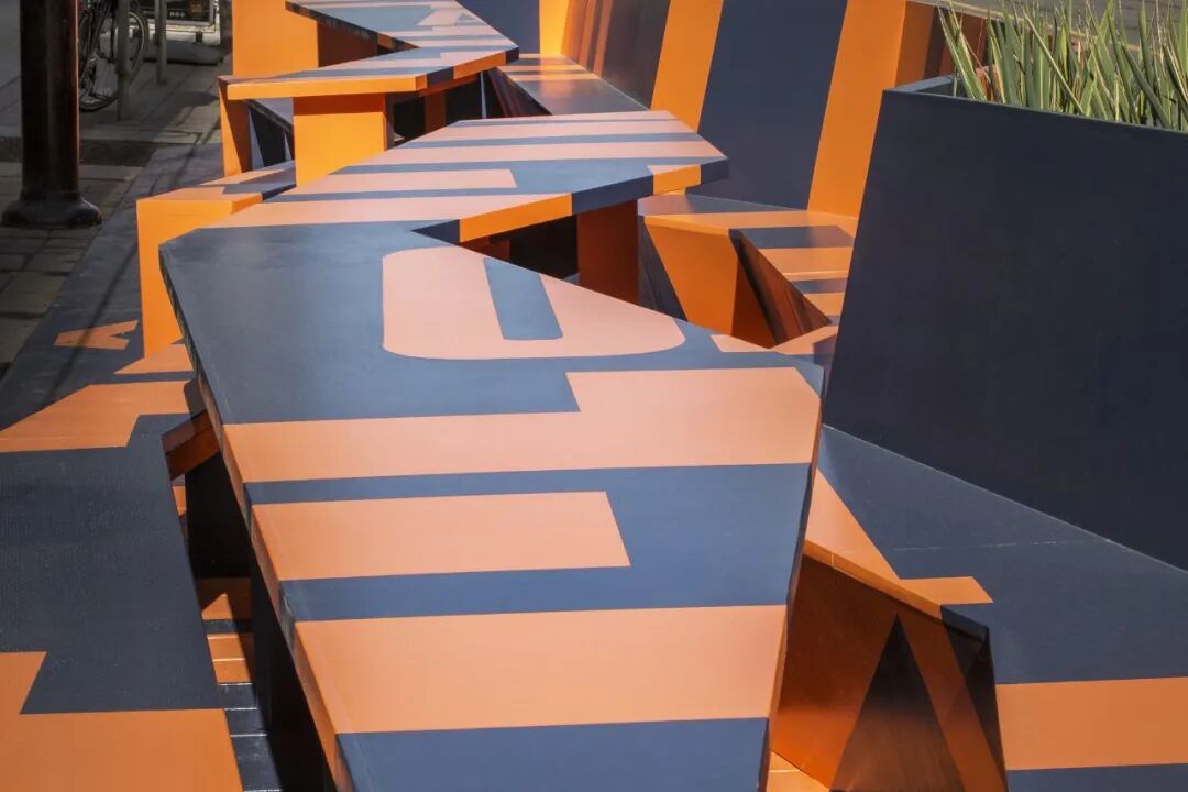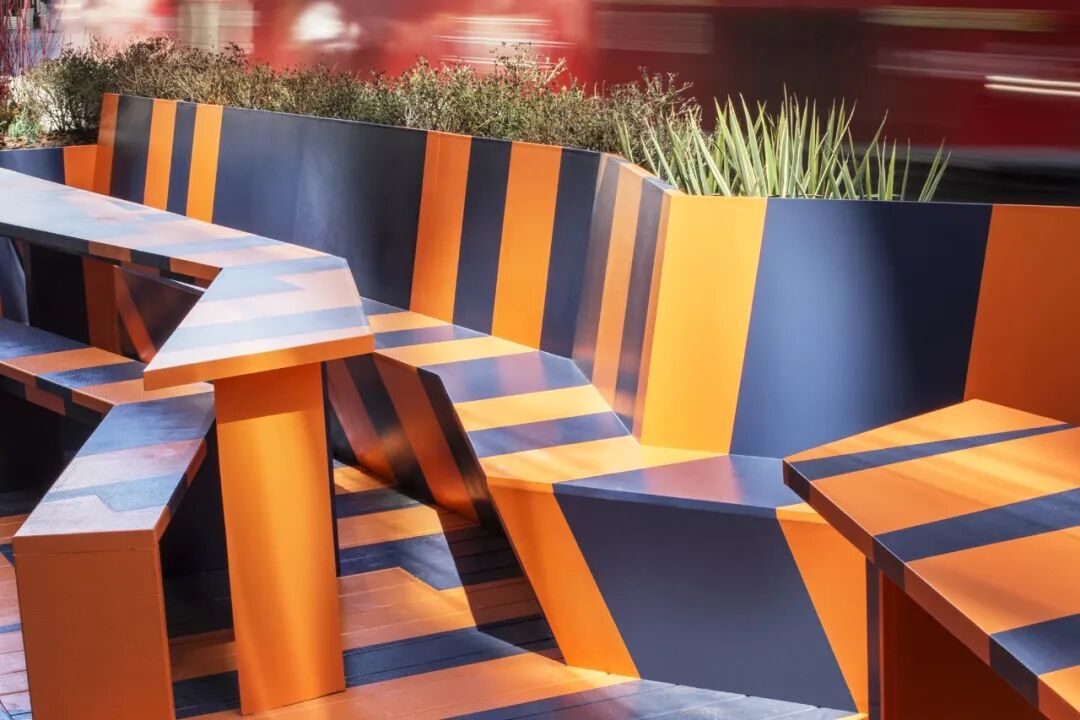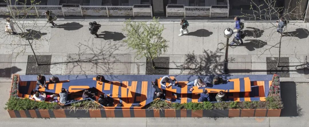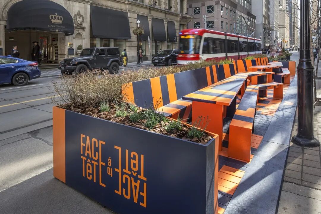该项目位于加拿大多伦多市中心的一个街区,创造了一个公共的交流场所,其鲜艳的橙蓝相间的条纹引人注目。长椅与长桌沿道路以不规则的折线形态放置,周围环绕着植物,开放式的设计吸引路人在此休憩与交流。