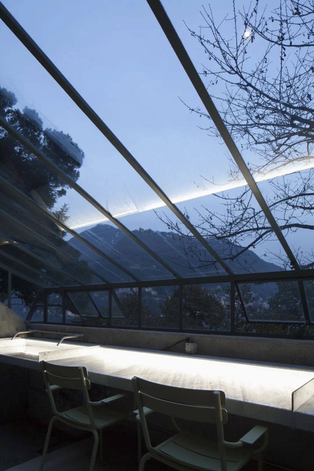 该项目是由一座废弃的建筑改造而成的,面向湖泊和城市景观。建筑结构的主体深入地下,因此,建筑师采用了全玻璃的屋顶,将自然光引入室内空间。