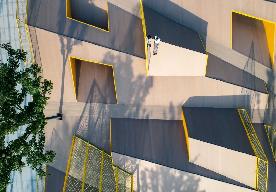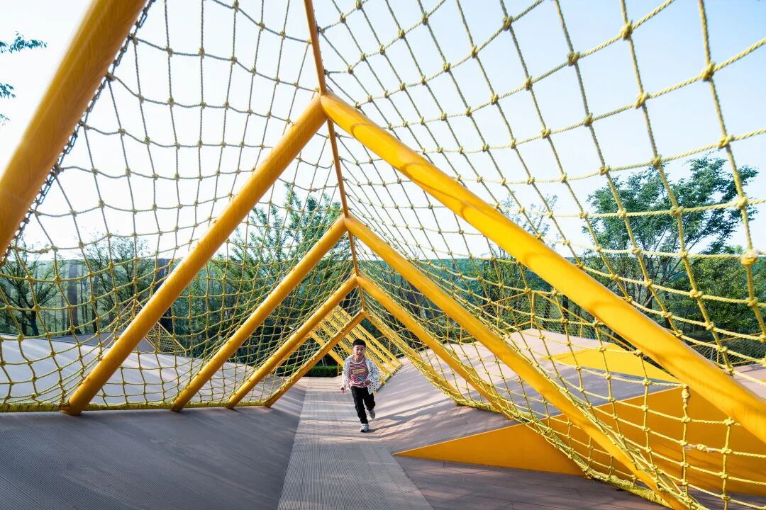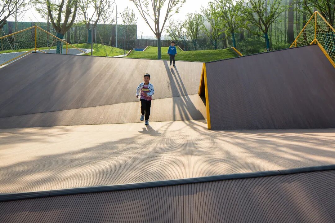 折叠乐园是一个社区游乐场,通过空间的折叠,调动孩子们对地形的感知。它的设计理念是回归基础,减少游乐场设备的使用。设计师相信折叠地形可以鼓励孩子们用手和脚感知空间。孩子们可以跑步、爬山、玩捉迷藏,还可以自己决定如何玩得开心,而家长也可以利用平台休憩与看护。