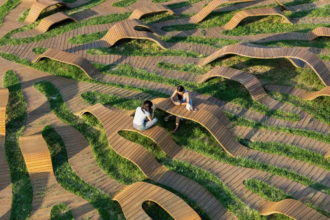 Root Bench位于韩国首尔的一片城市绿地,是一个直径为100英尺(约30米)的公共家具。其整体结构由混凝土基础与金属框架支撑,木板覆盖其上。该装置模拟了植物的根系形态,起伏的“根系”提供了多样的空间,儿童和成人都可以自由地将其作为坐凳、桌子或玩耍的装置等等。