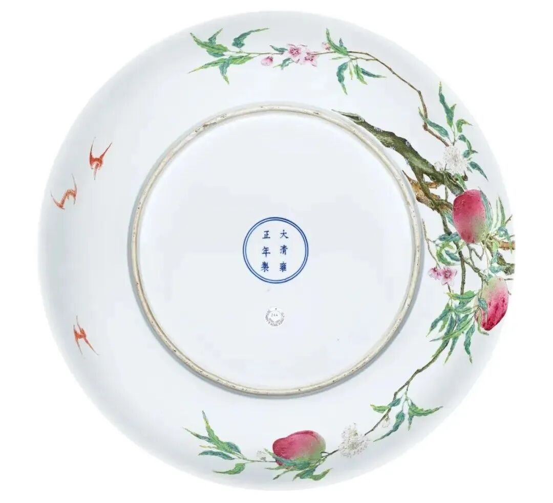 刘氏典藏清代瓷器中,则有雍正粉彩福寿双全图大盘,桃花盛绽,果实累累,枝叶茂密,过墙而生,曾先后为岩崎男爵及芭芭拉.赫顿典藏,来源出众。寿桃乃让御窑艺匠发挥所长的绝佳题材,在嫩青与殷红之间,变化微妙的粉彩调色活现了桃实之娇艳欲滴。纵有数例传世,每器绘画稍异,不尽相同。