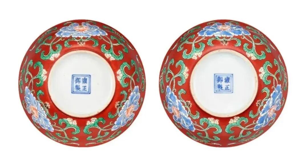 清雍正 珊瑚红地五彩折枝花卉纹浅碗一对