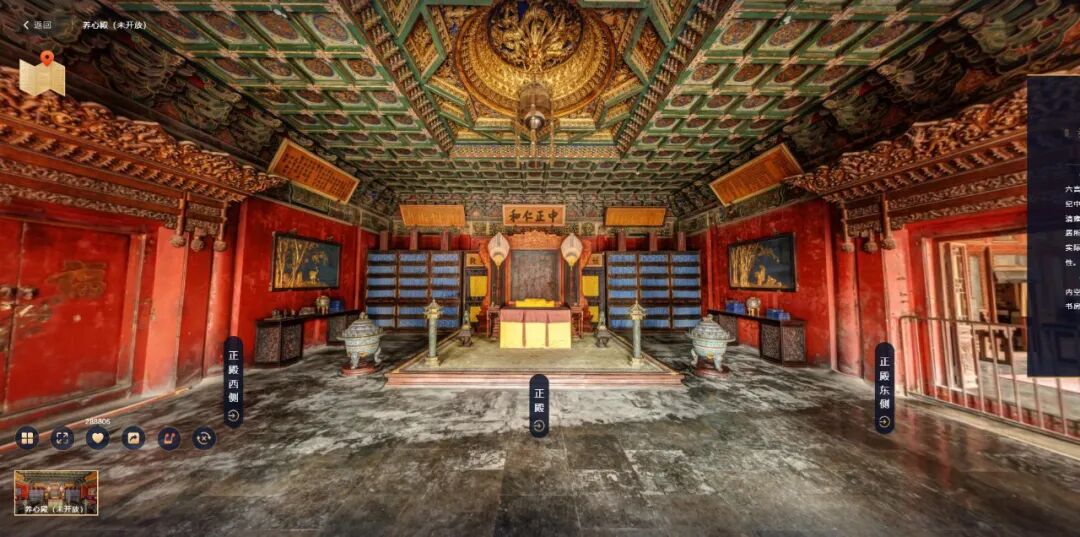 2017年,养心殿因修缮暂时关闭,故宫在“发现·养心殿——主题数字体验展”开发了虚拟现实VIVE体验区。观众通过虚拟体验进入养心殿正殿和后寝殿里,探索室内空间的知识内容。观众还可从异于实体参观的视角看到养心殿,并欣赏到精选的陶瓷、玻璃、金银器、玉器、青铜、雕漆等文物的高精度三维模型,以交互方式体验其制作工艺、纹饰特点、使用方式等。