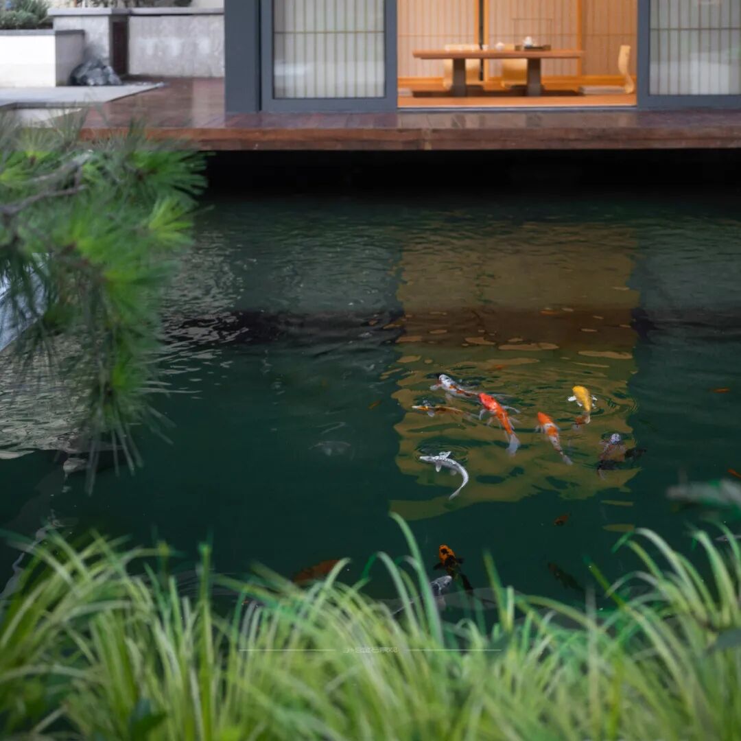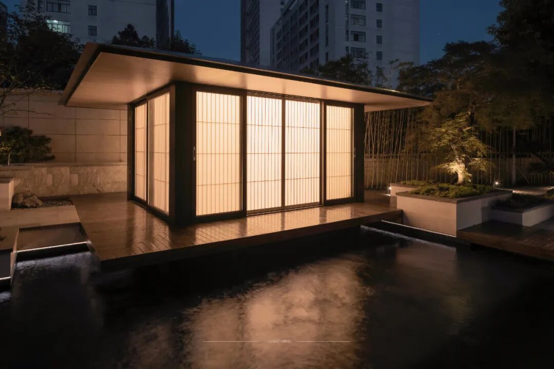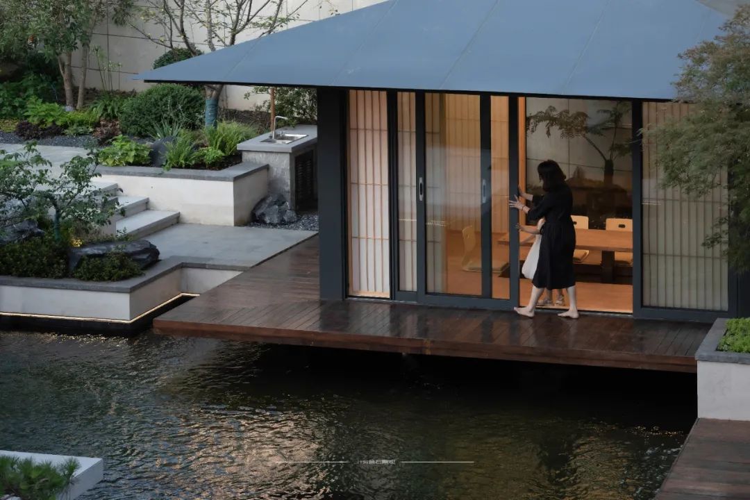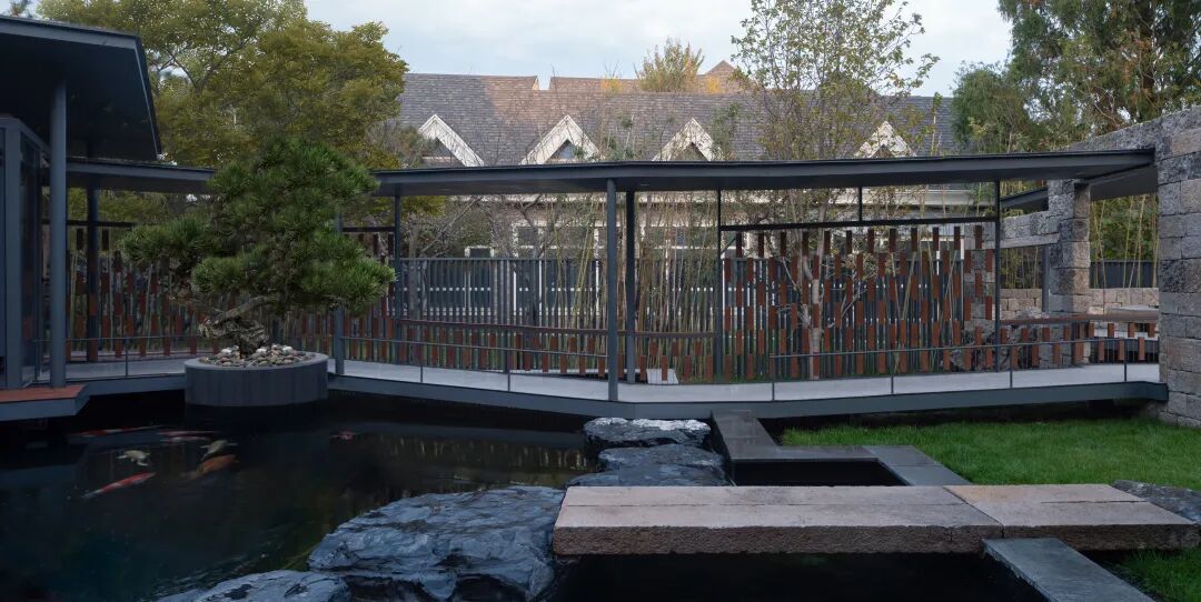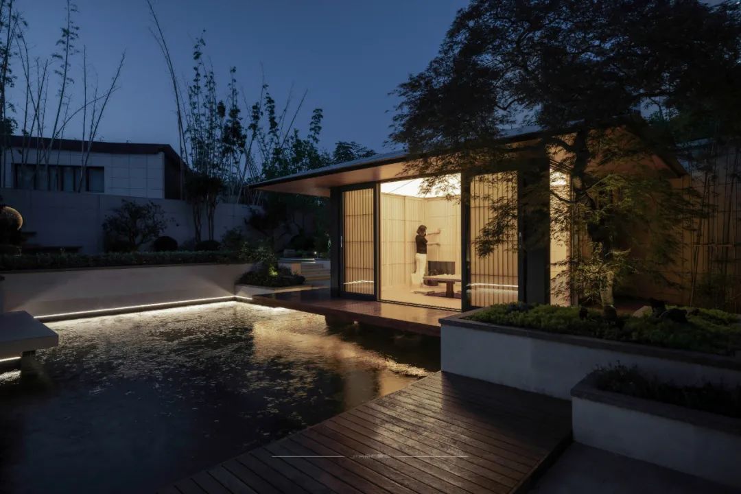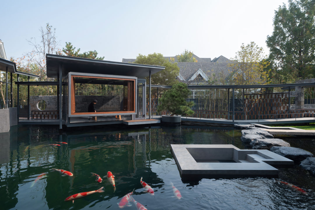 对景茶室,临鱼池之上,亦和建筑形成对景关系,建筑风格参考隈研吾的建筑风格,遵循茶道中空寂茶道风格建造,茶室虽自成一景,但坐在其中亦可向周围借景。