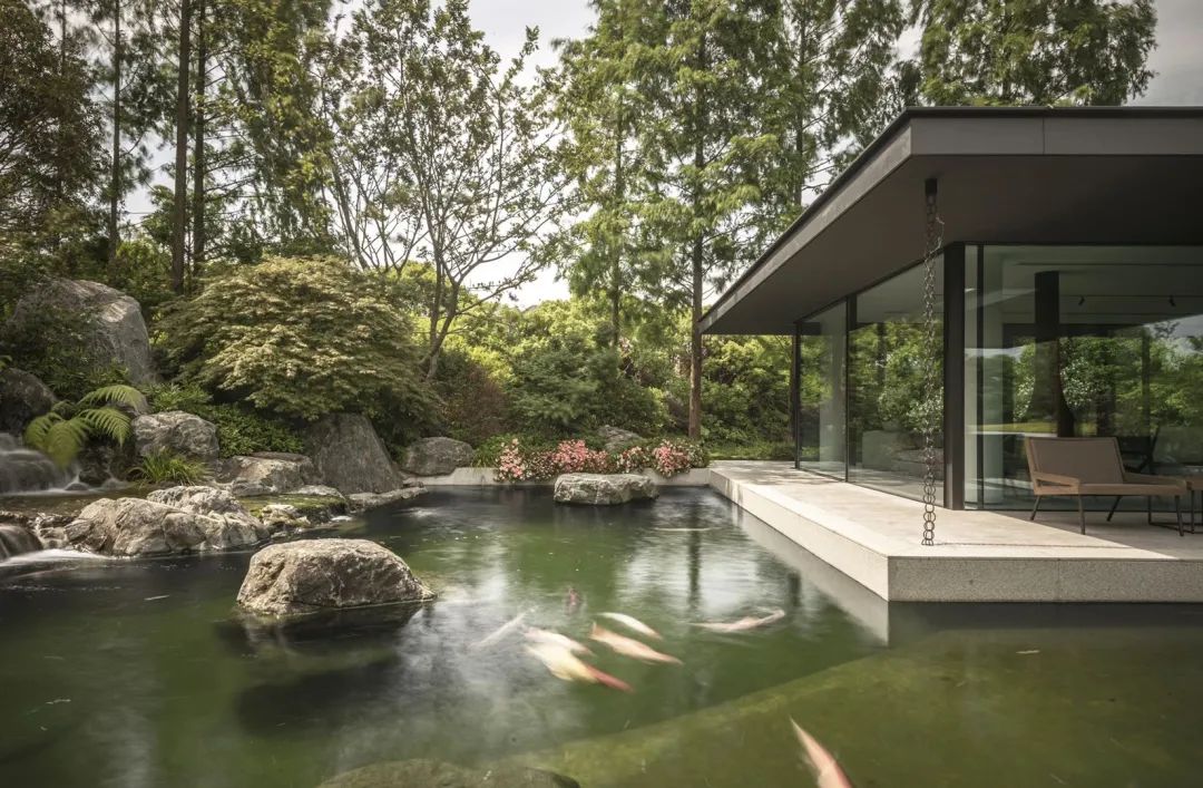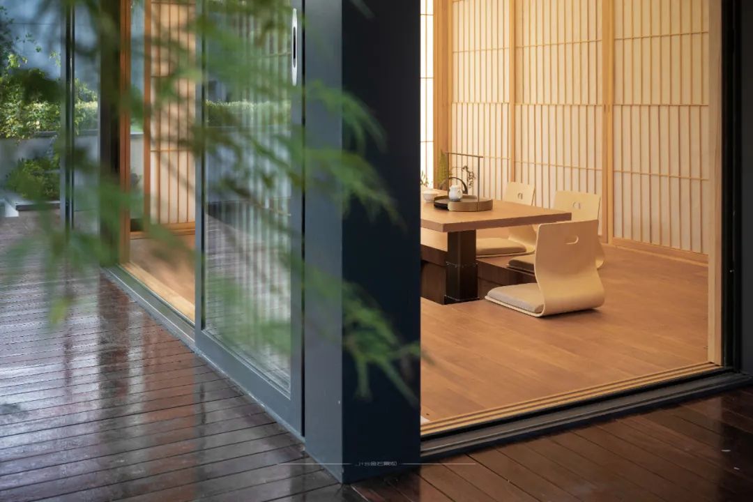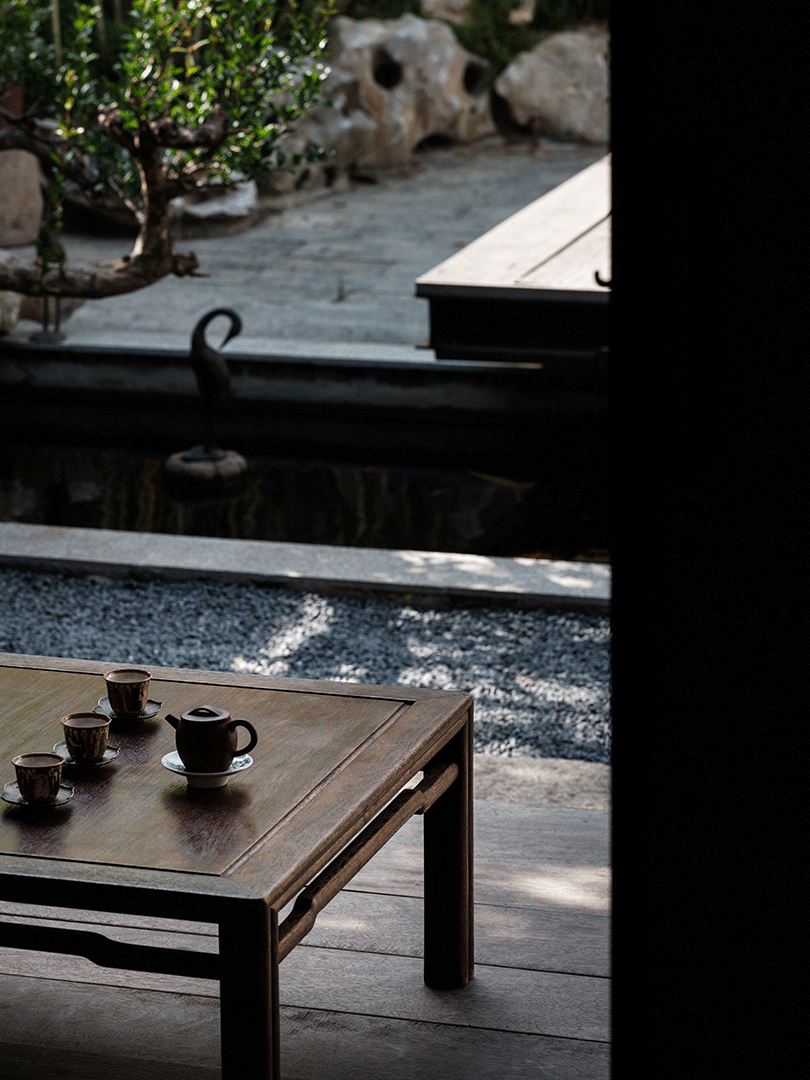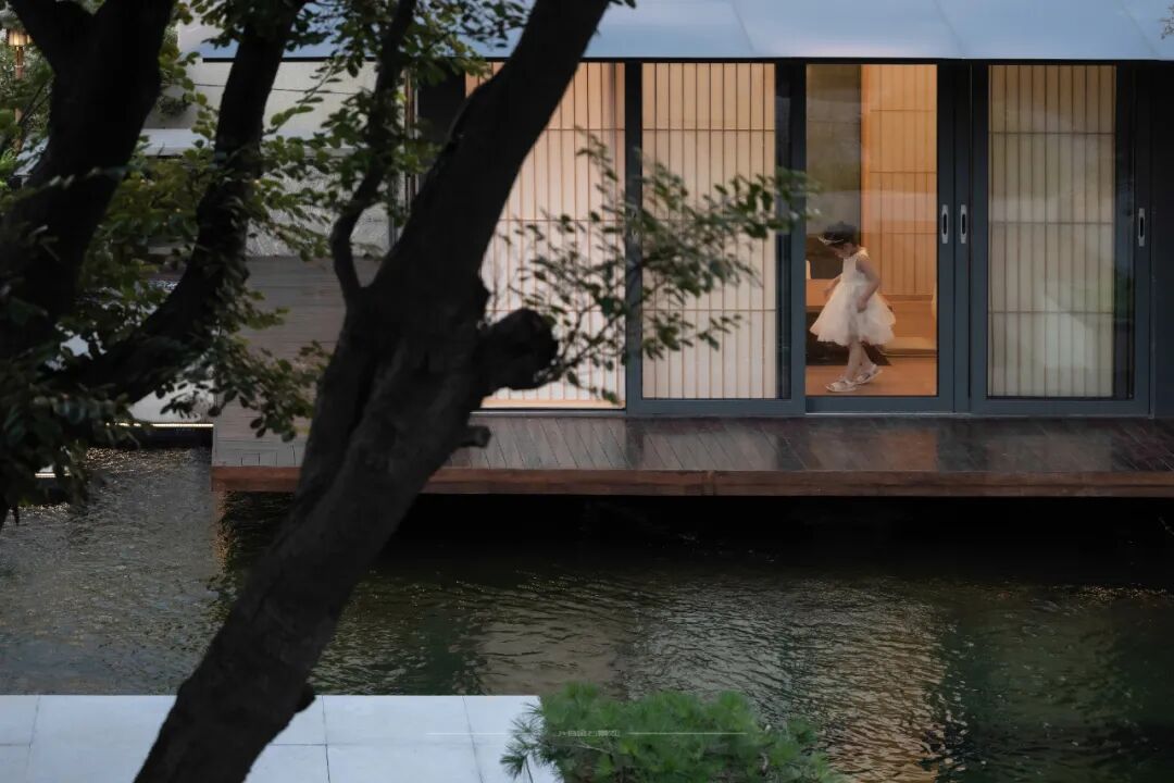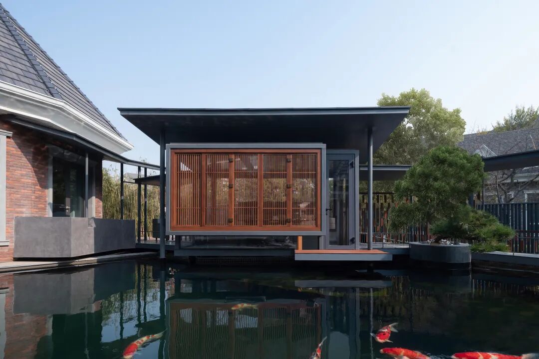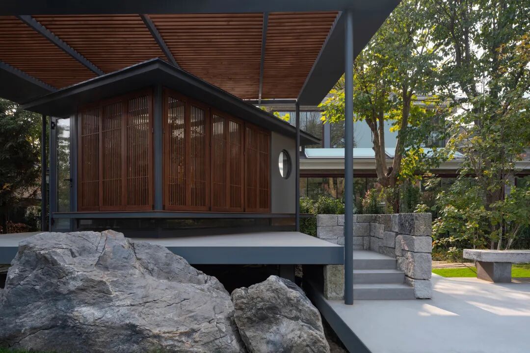 对景茶室,临鱼池之上,亦和建筑形成对景关系,建筑风格参考隈研吾的建筑风格,遵循茶道中空寂茶道风格建造,茶室虽自成一景,但坐在其中亦可向周围借景。