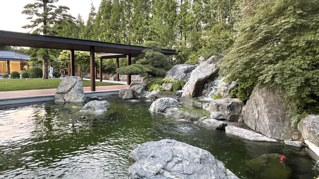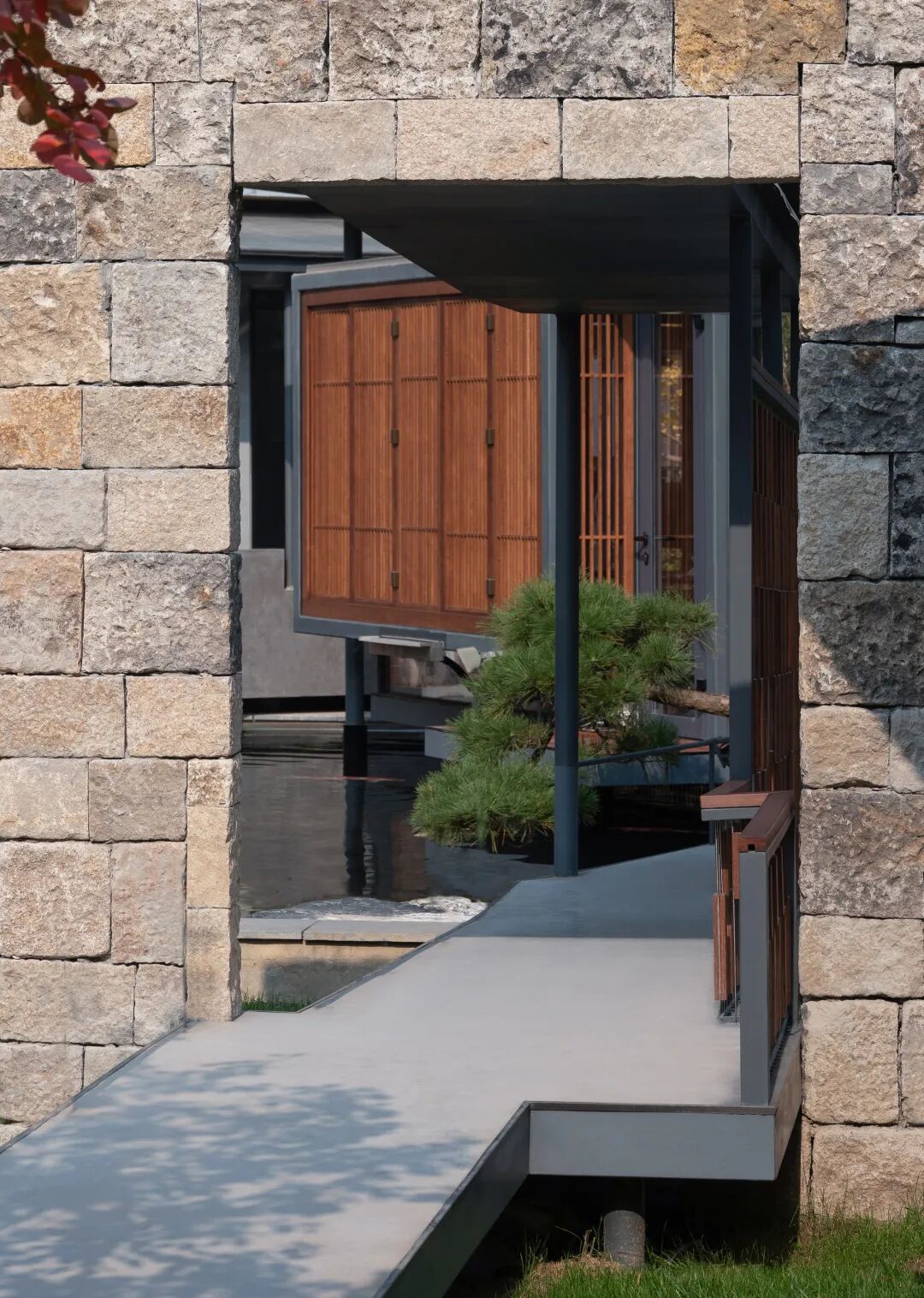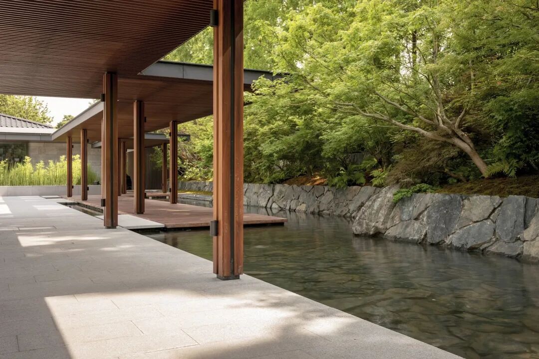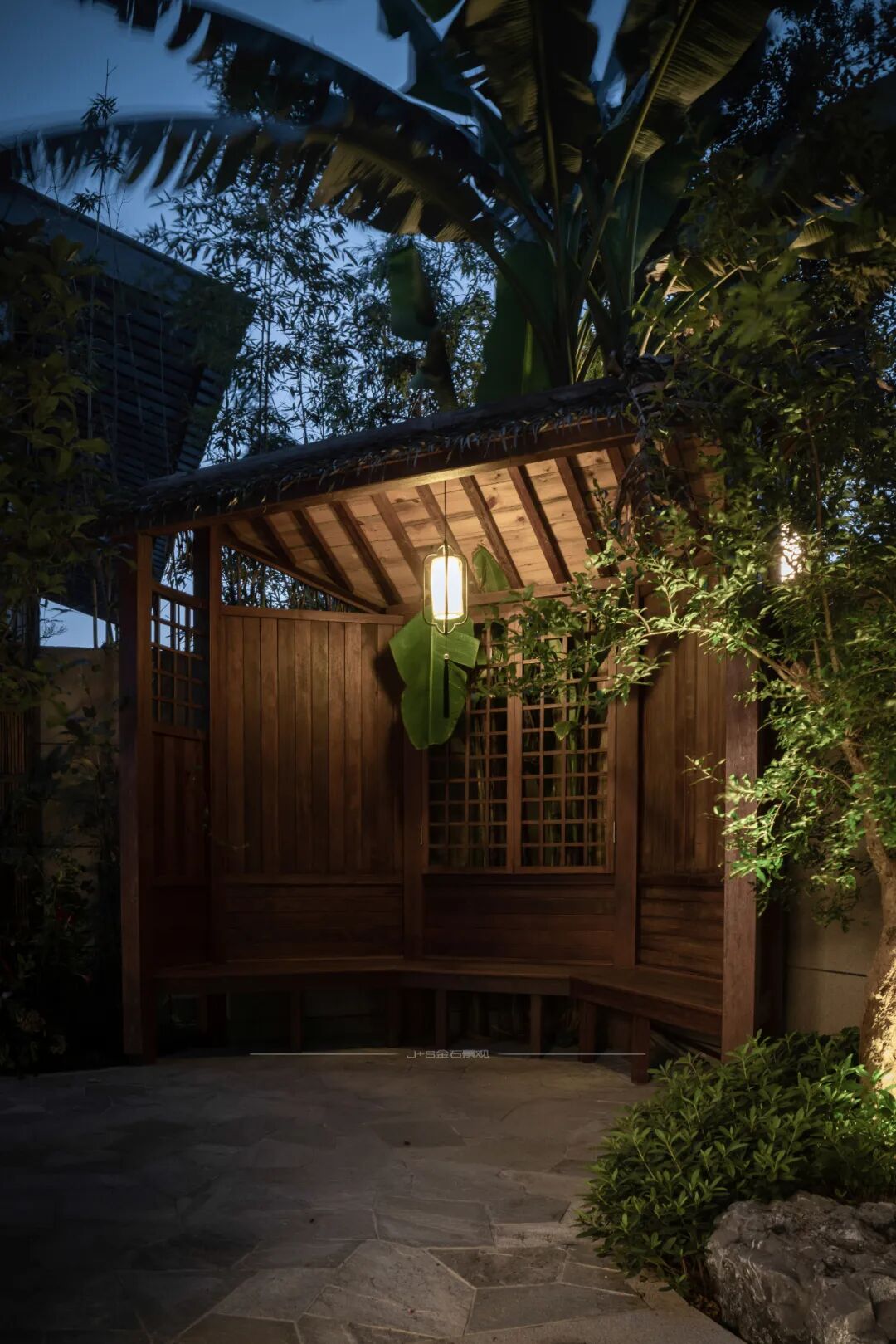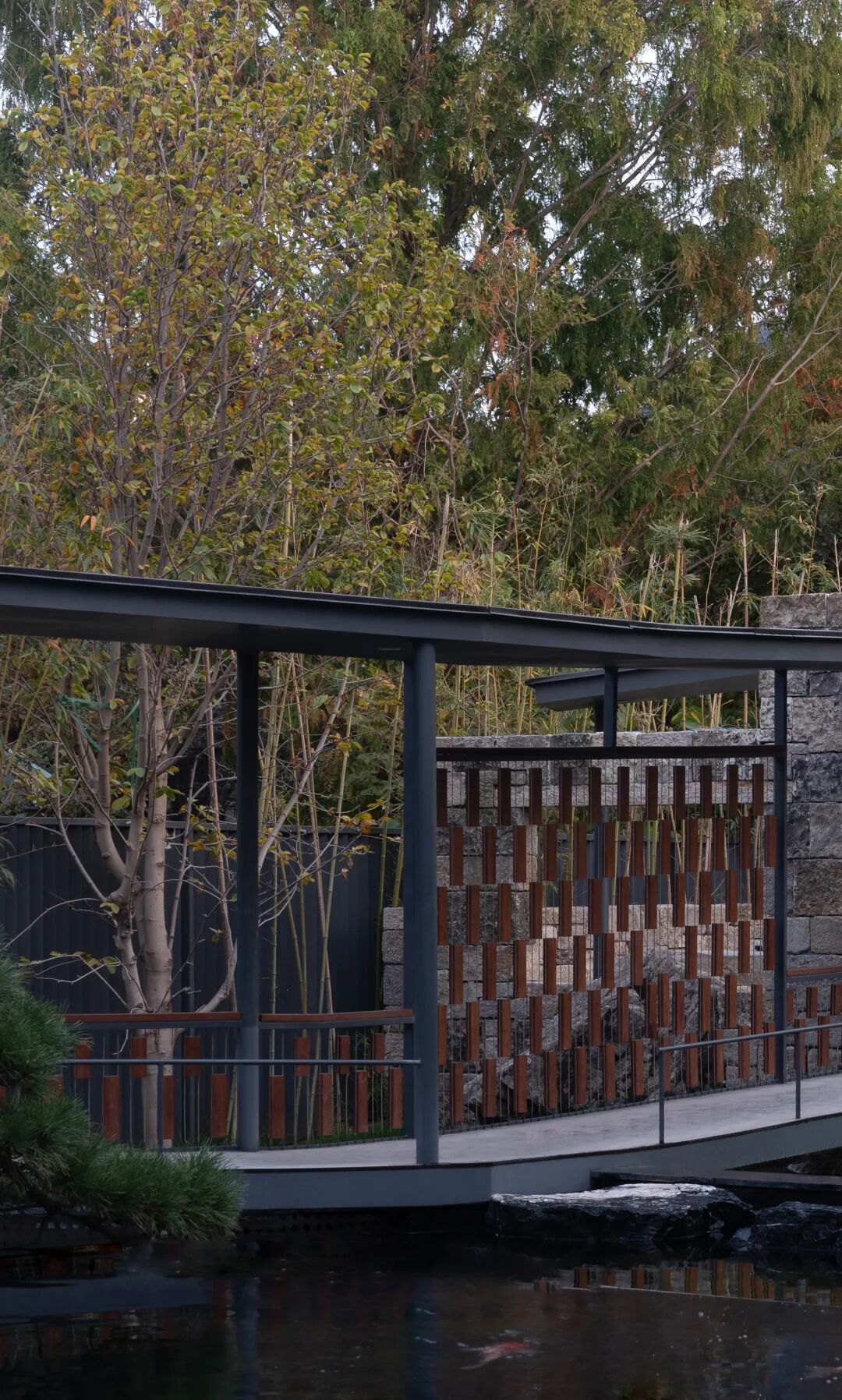 对景茶室,临鱼池之上,亦和建筑形成对景关系,建筑风格参考隈研吾的建筑风格,遵循茶道中空寂茶道风格建造,茶室虽自成一景,但坐在其中亦可向周围借景。
