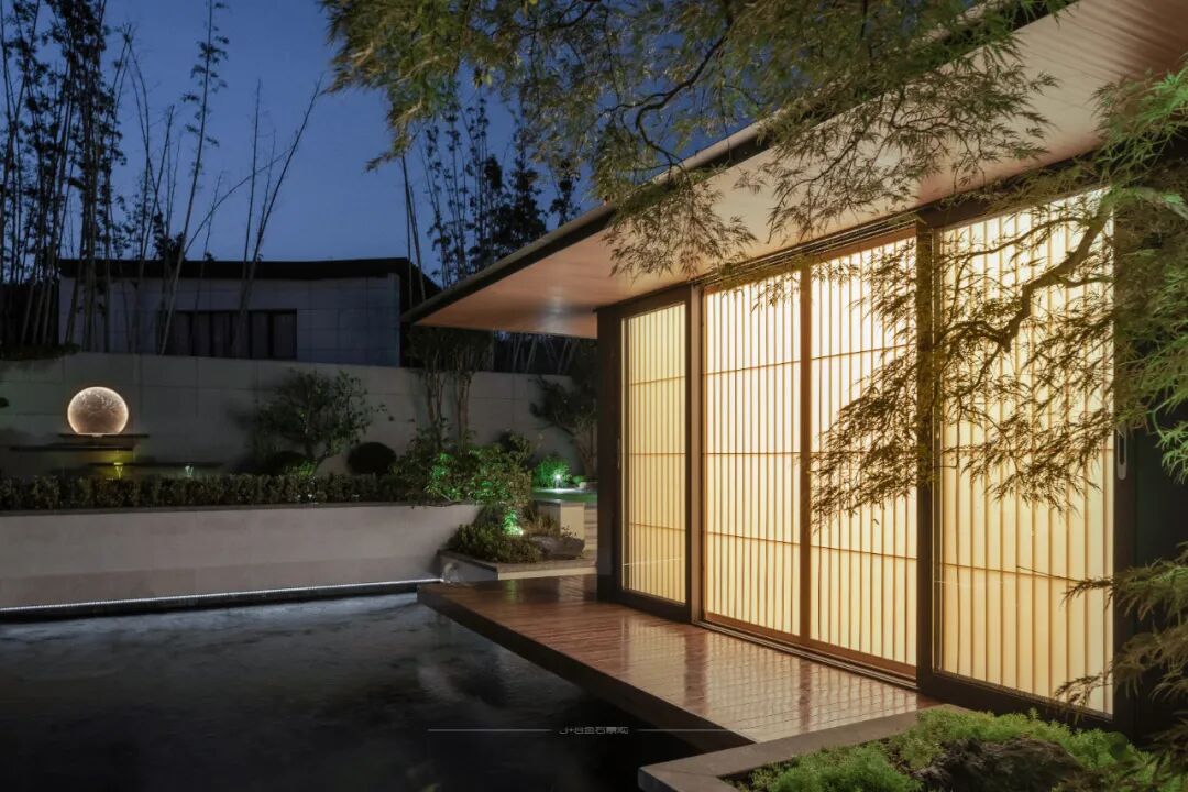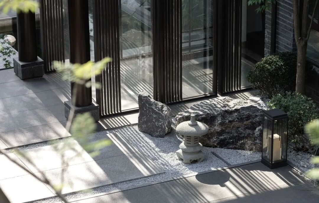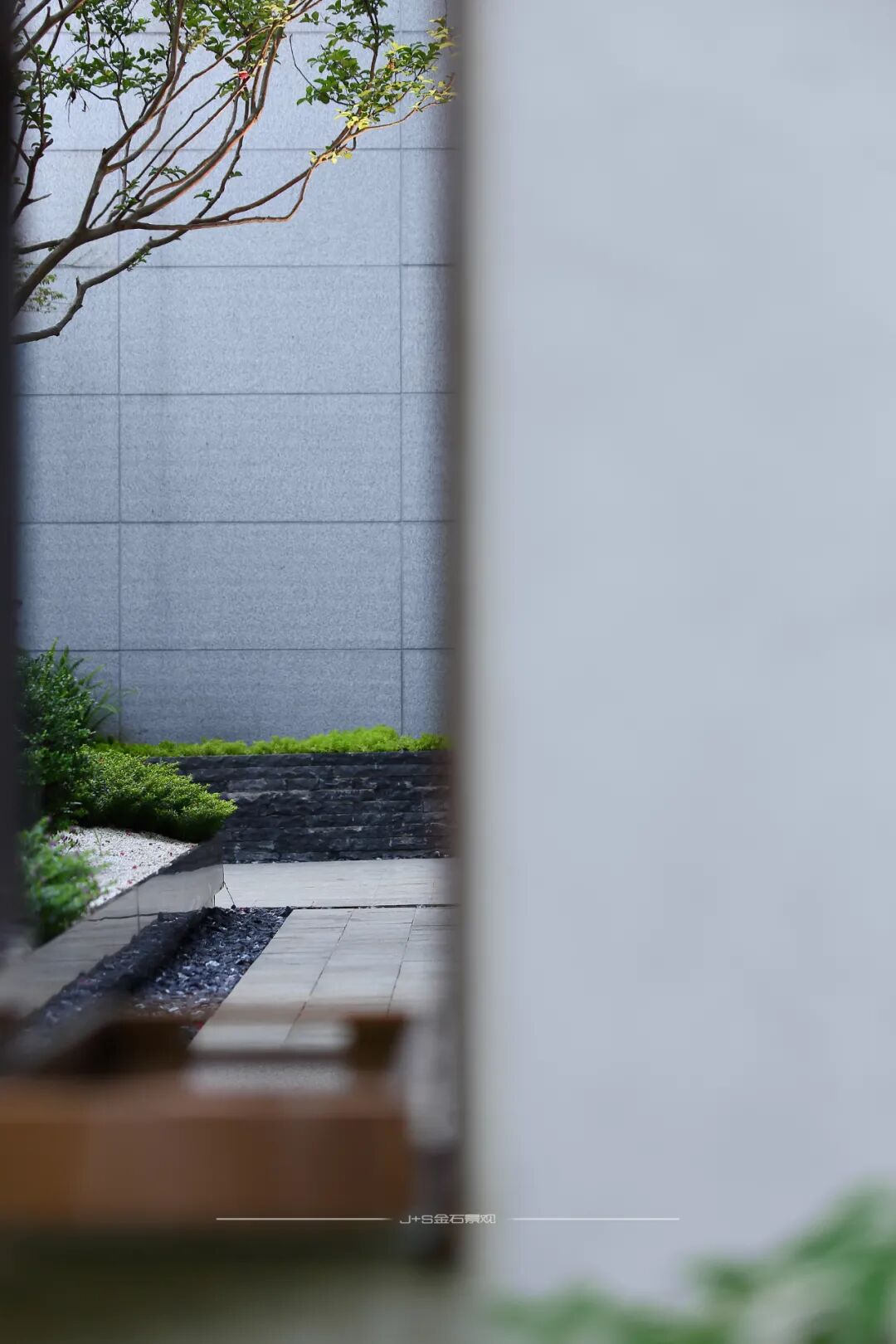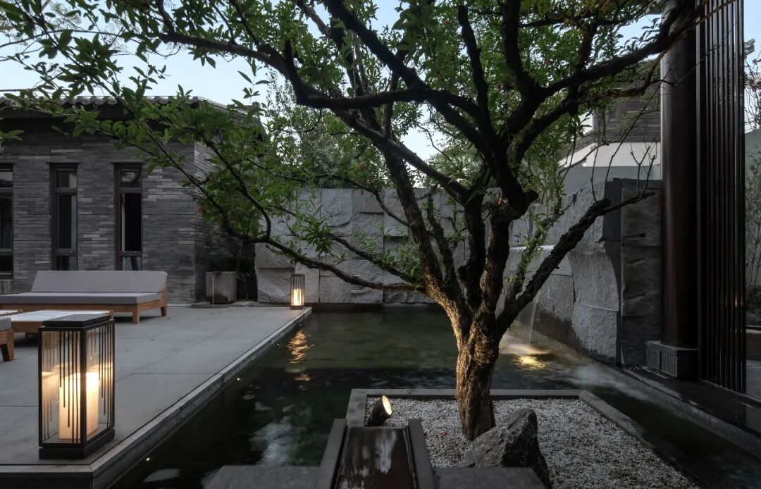 项目位于九间堂一期,临康厚街,虽未避市侩之嚣,但亦有陶渊明结庐人境之趣。不同于样板庭院的林泉高致之师古手法,用更契合建筑气质的现代手法结合当代崇尚的东方意境去塑造景观,从建筑,人与环境出发,去思考场地、建筑及现代人居的关系,最终营造一种极具东方意境之美的景观,又不悖于现代人居生活所需求的庭院生活,两者和谐统一,相得益彰。