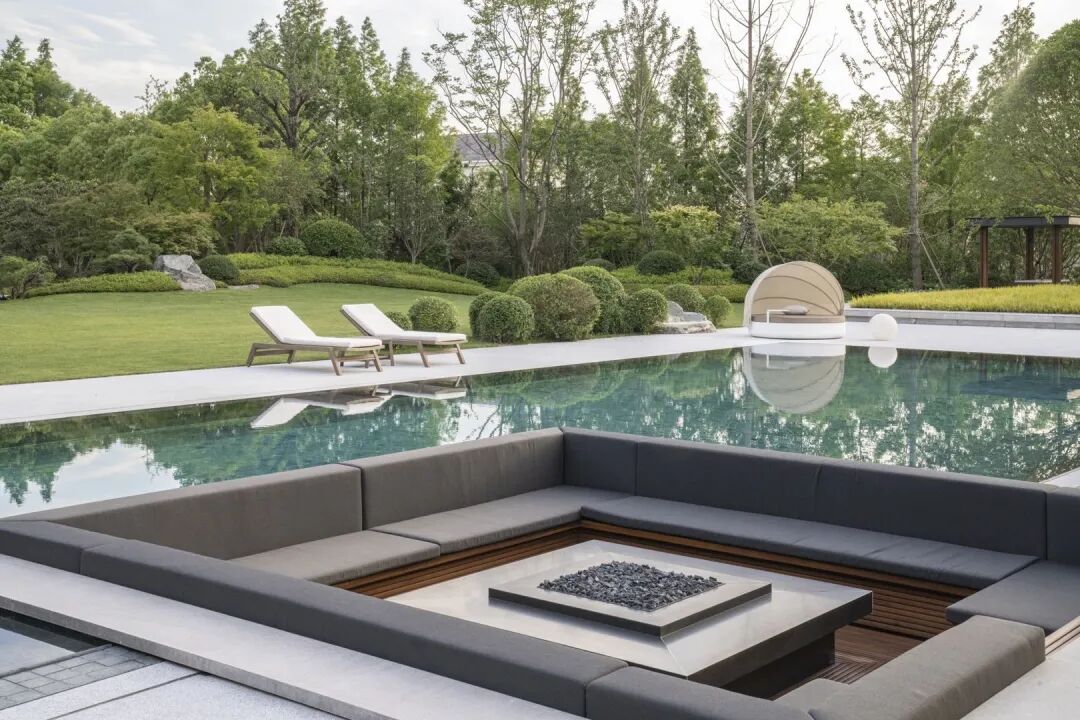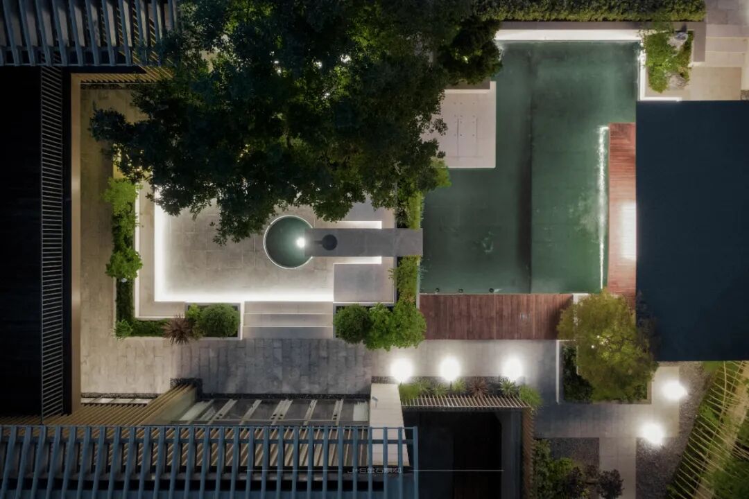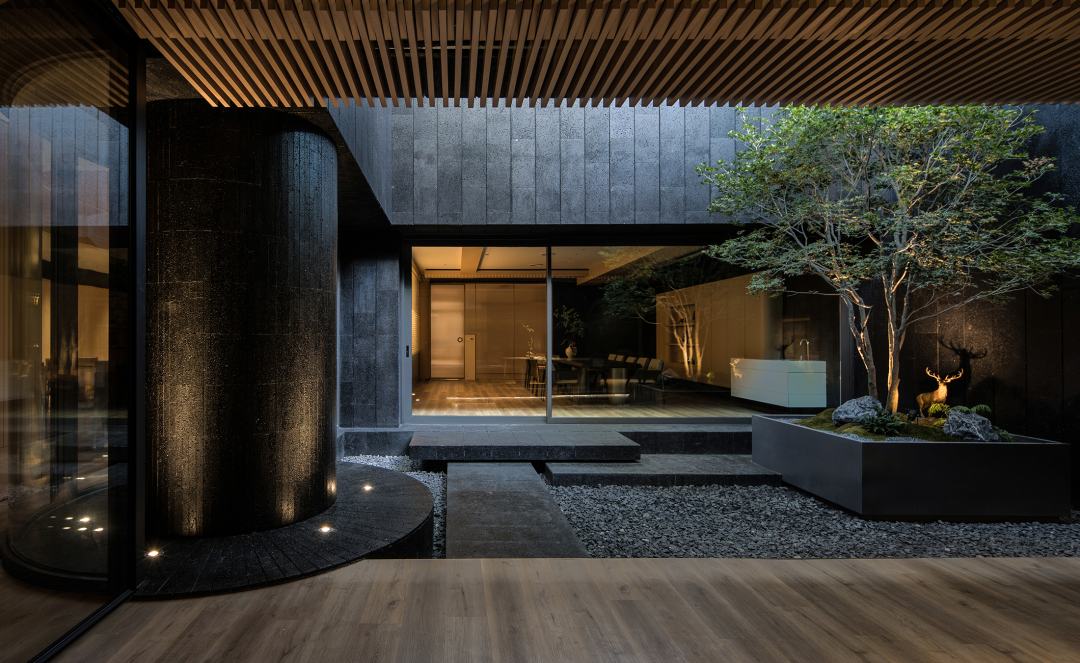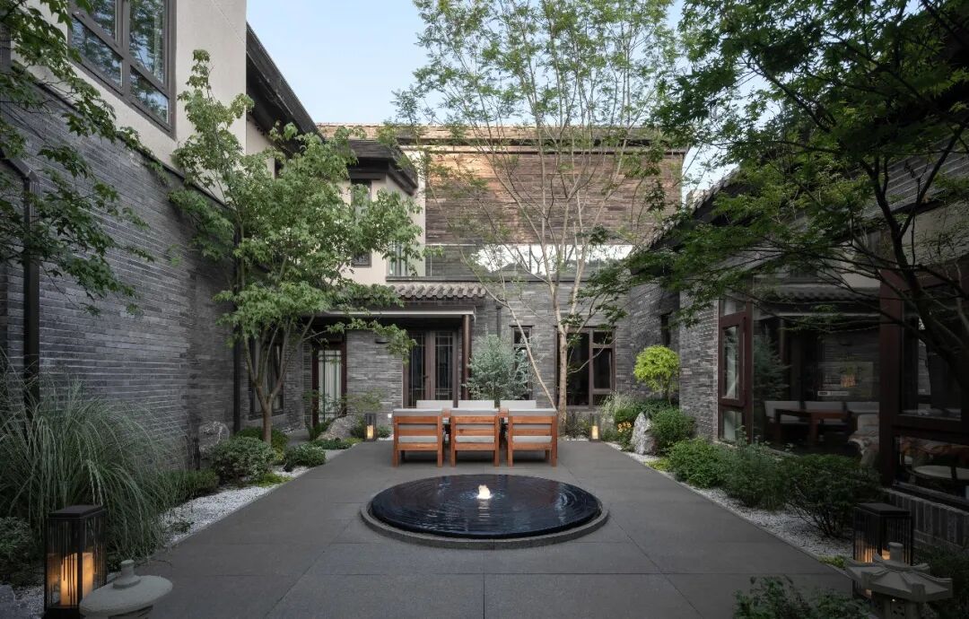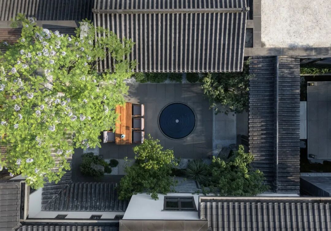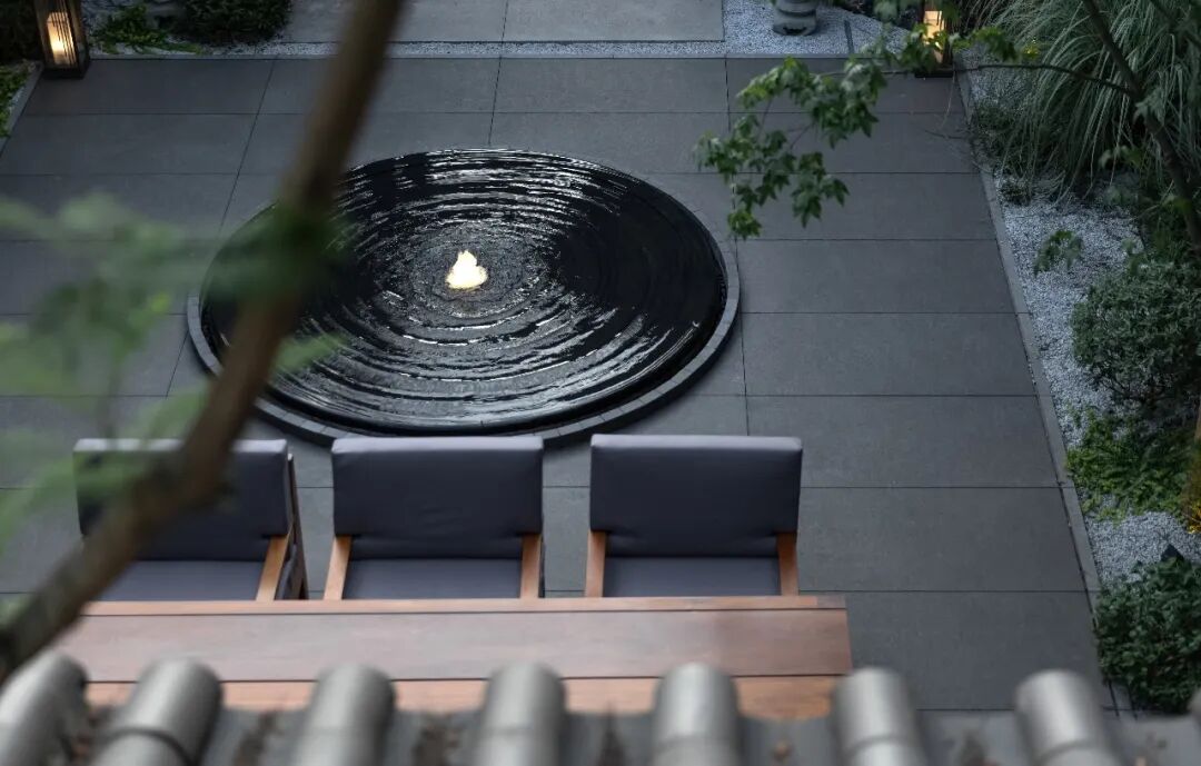 中心庭院 在建筑半围合的中心空间做下沉式处理,同时在中心轴线位置设计了一个圆形镜面叠水水景,取团圆,和谐圆满之意。这也是对业主新宅落成后未来生活的祝福和愿景。