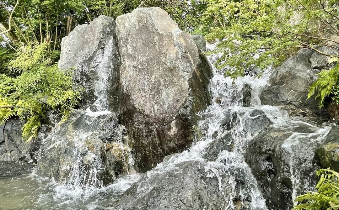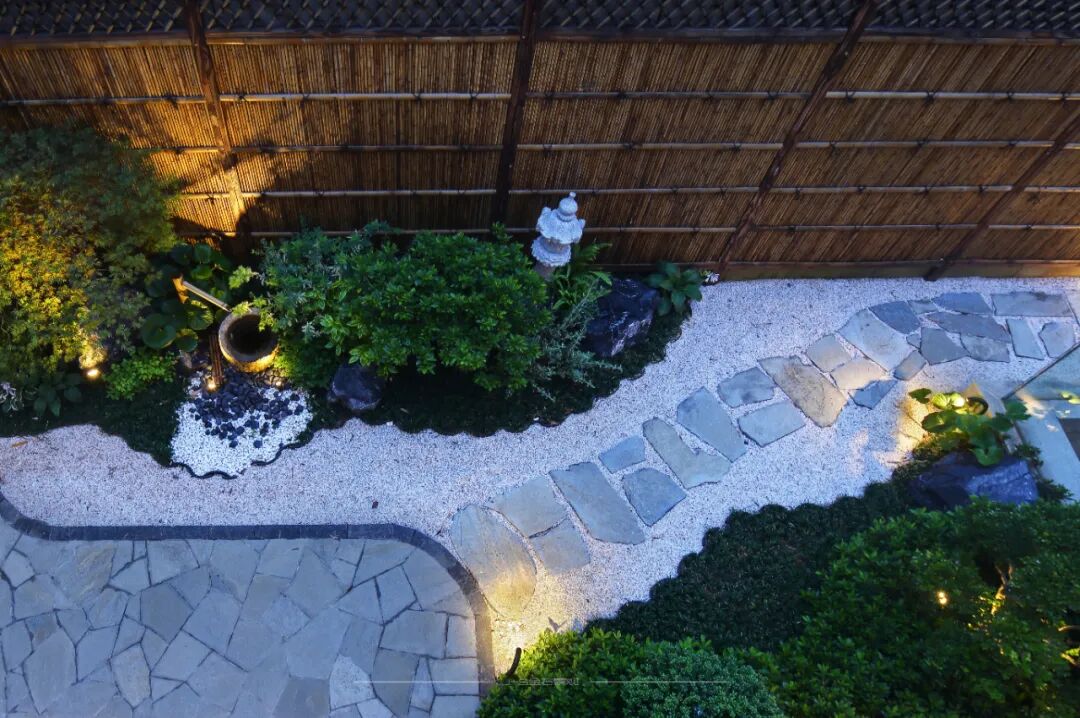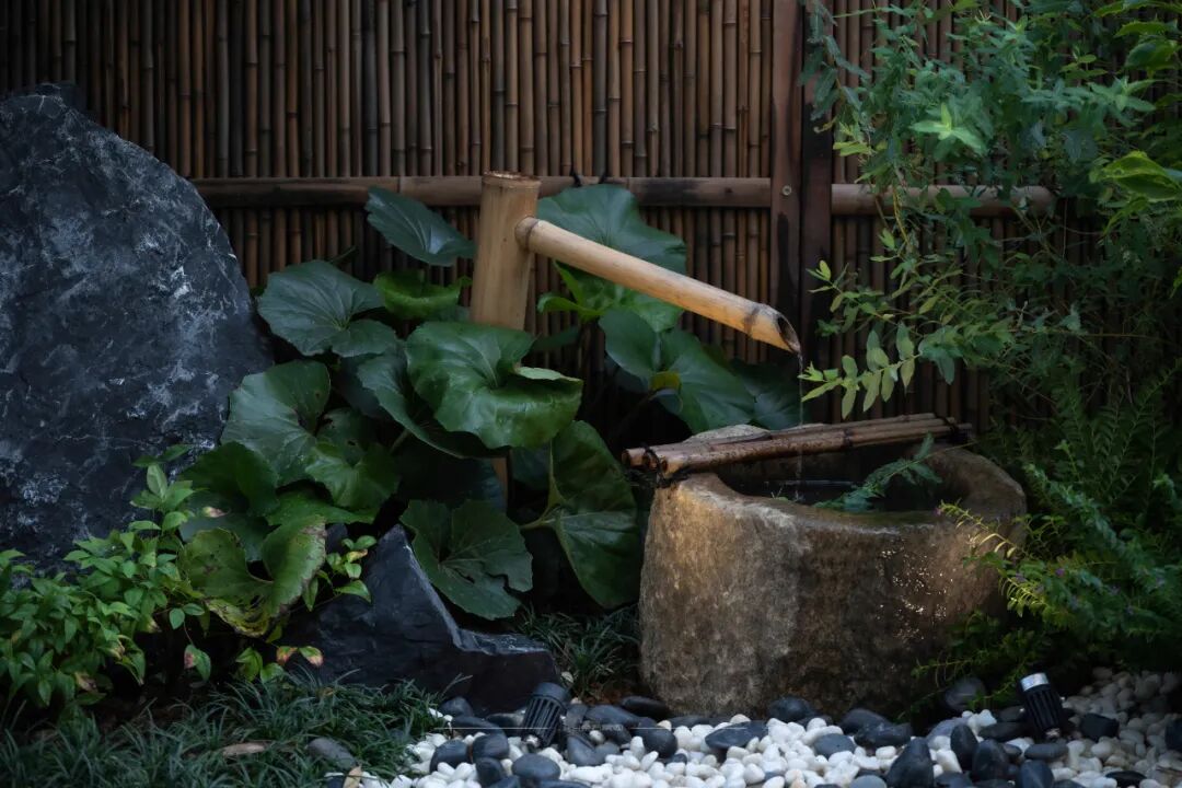 西院属于窄长型天地,设备与天井占据了大部分空间,对应建筑为餐厅,从功能上主要满足通行及氛围营造即可,因此采用日式园林风格造景