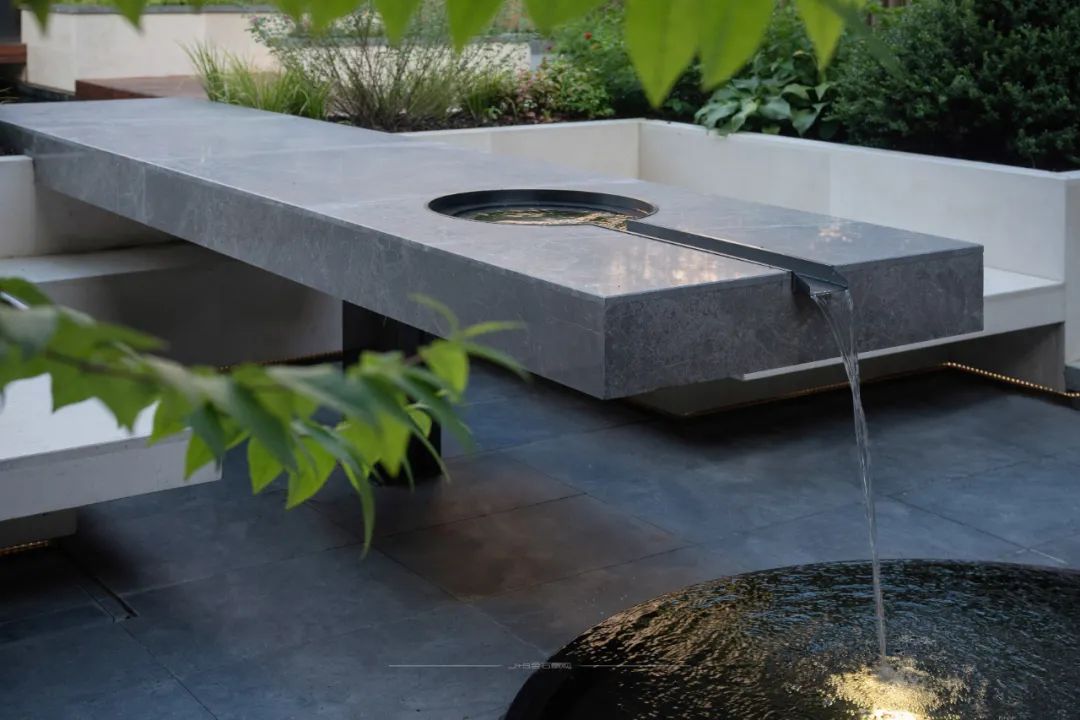 圆形跌水,是室内会客厅对外的视觉焦点,将鱼池中的水跌入下沉空间,下沉空间设置圆形镜面水池,四面环抱,藏风聚气。