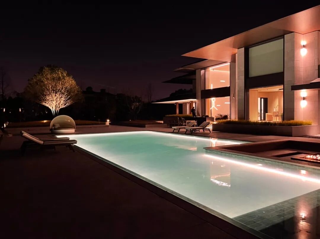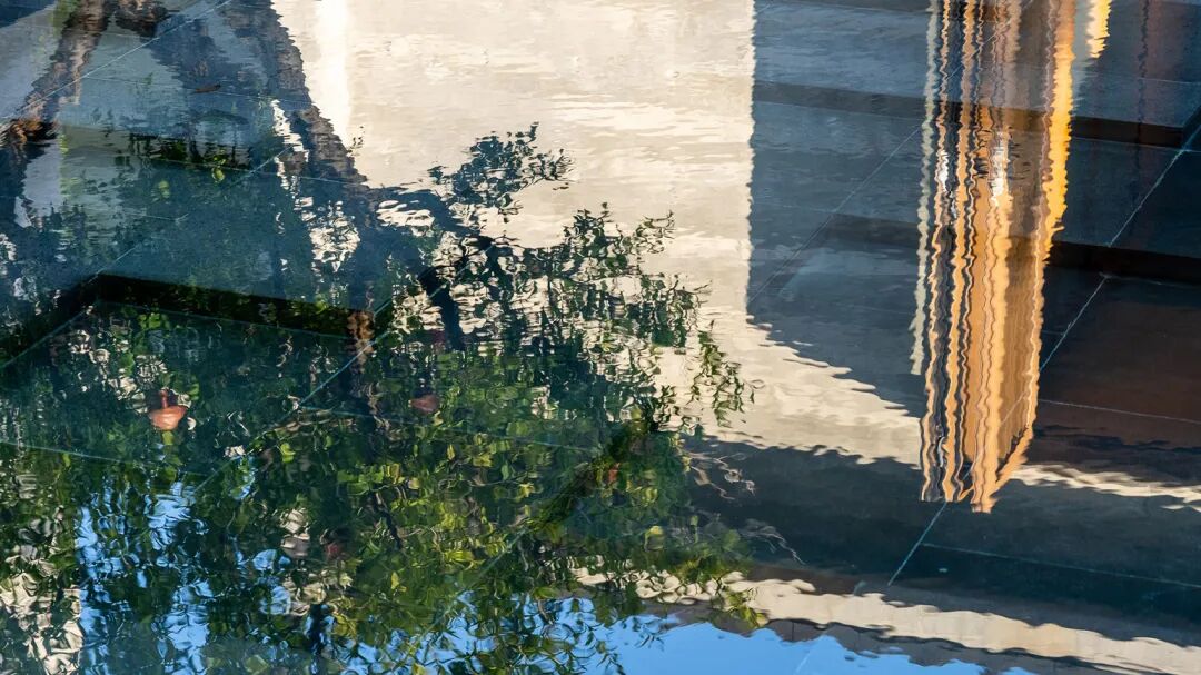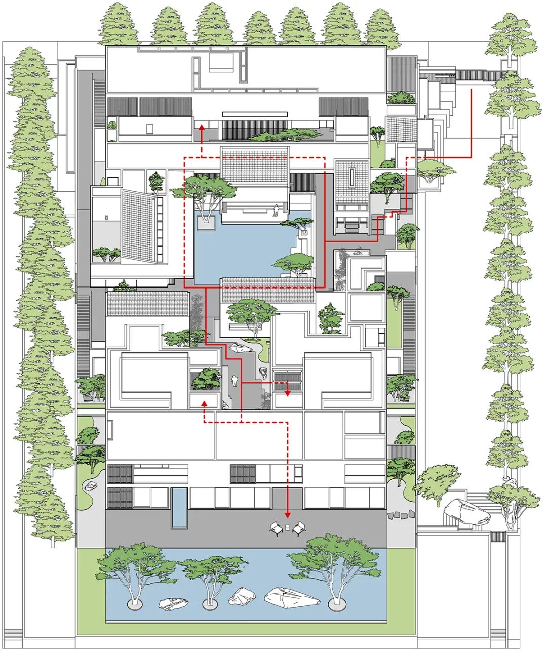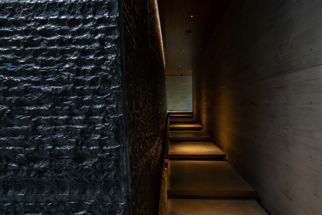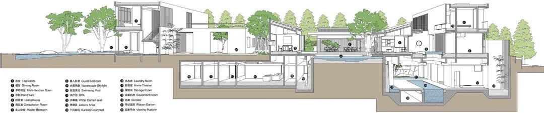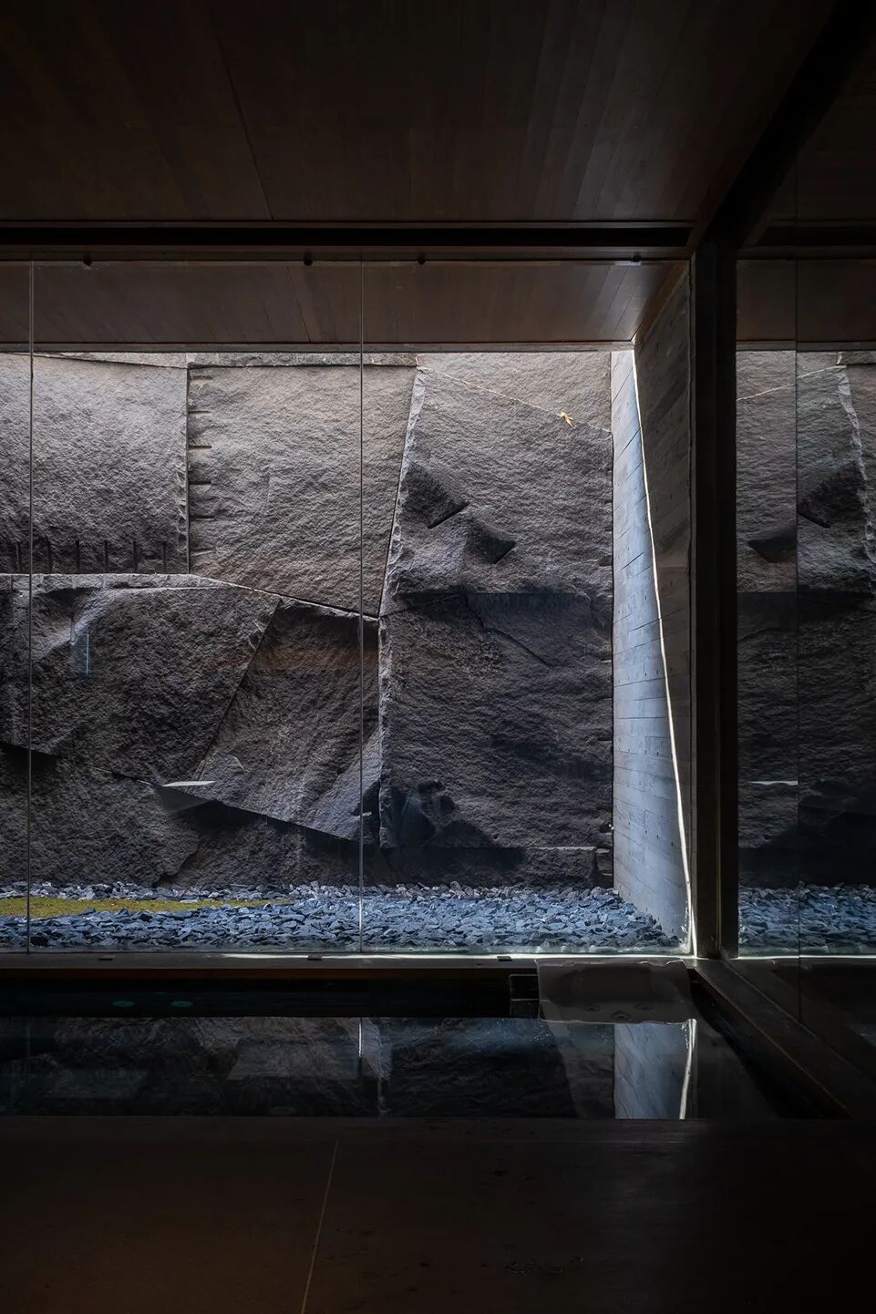 为适应业主的游泳习惯,地下层内设计了恒温泳池。在多个方位掏开的下沉庭院,以及泳池上方的水景天窗,引入了充足的光线。泳池区通过廊道连通居住区的地下部分,廊道一侧的水幕墙将一层水院的水流缓缓引下。