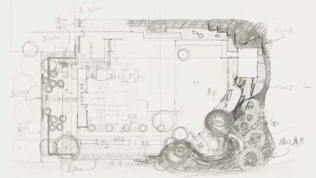 项目为改造设计,业主全权委托进行设计和落地。与业主沟通时强调既要控制成本又要考虑效果为改造原则,经过反复推敲室内外空间关系,重新梳理空间局部后,决定把场地中原有廊架拆除,鱼池局部改造,假山叠水拆除结合花镜打造;考虑场地土方平衡,重新定义并丰富场地竖向关系;原有防腐木为品质较好,与地面石材均可二次利用。保留现有大树,强化原有主景植物的造景效果。