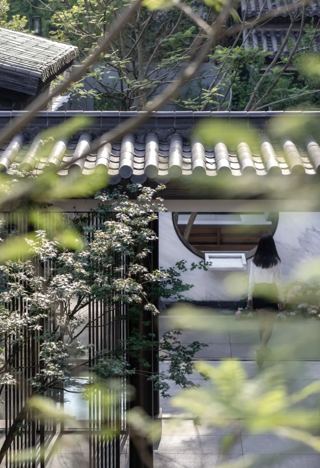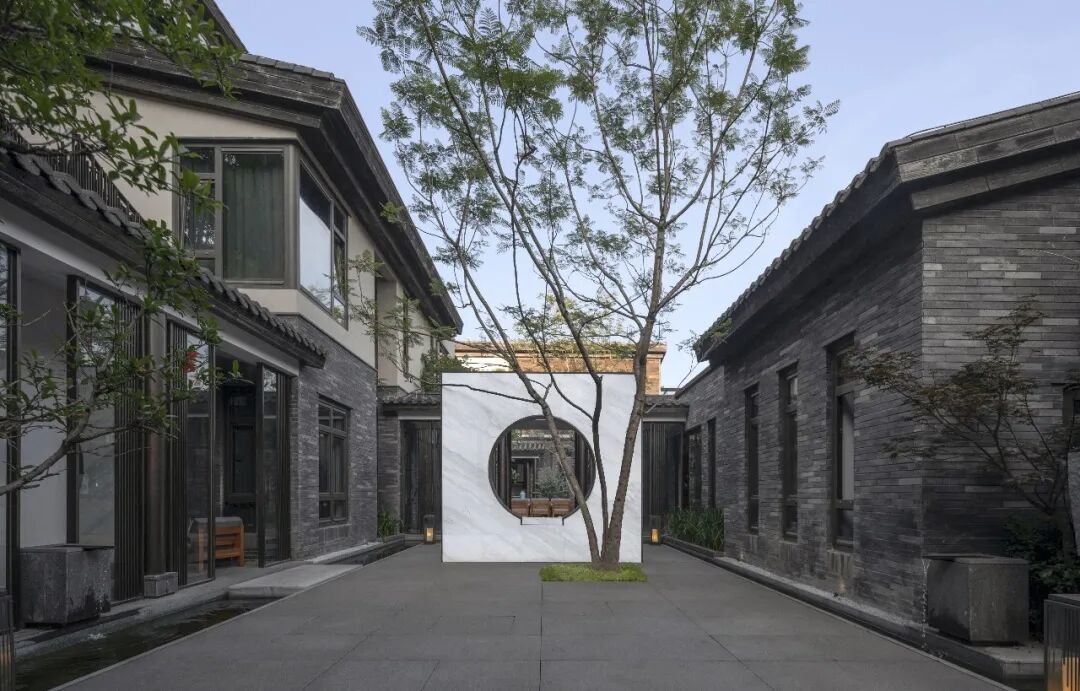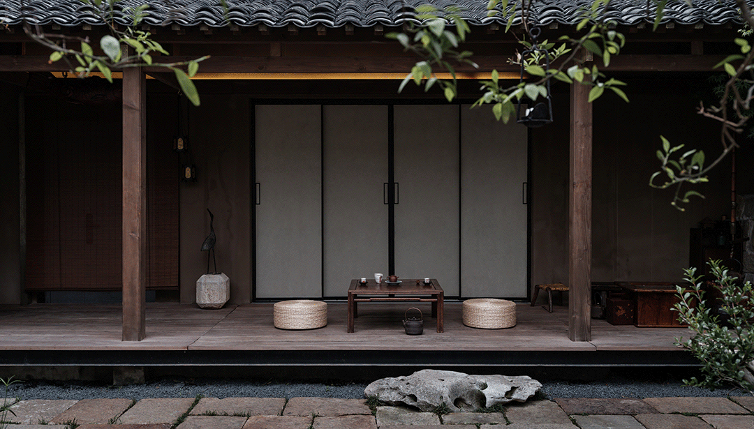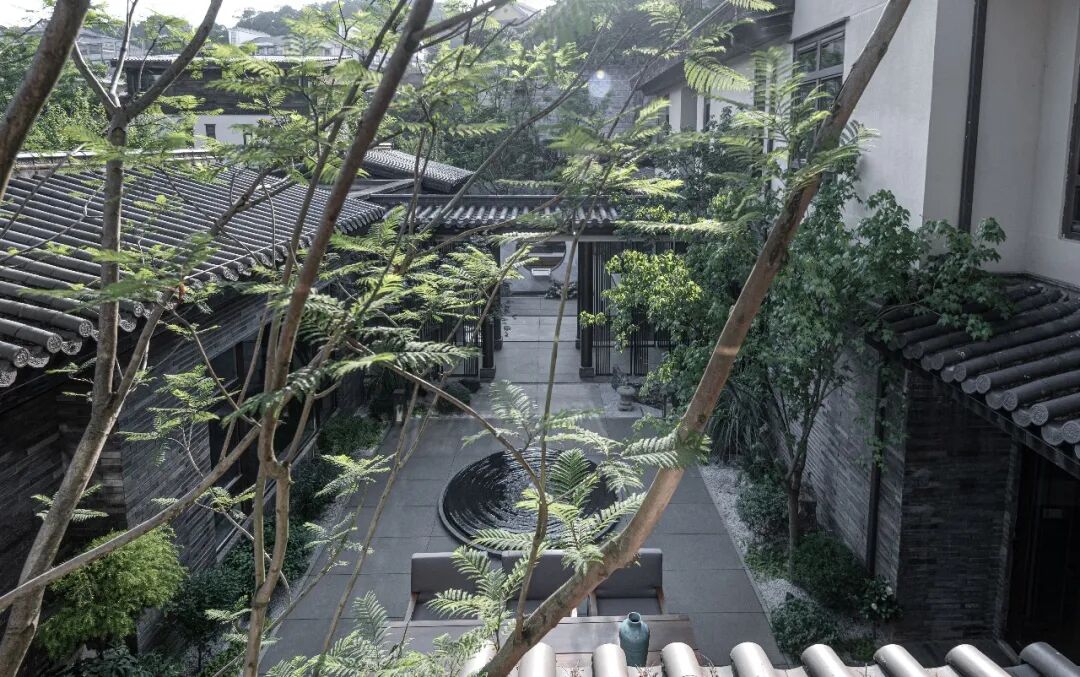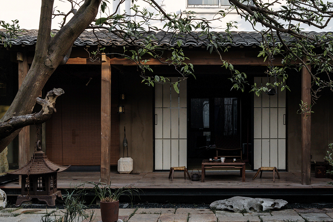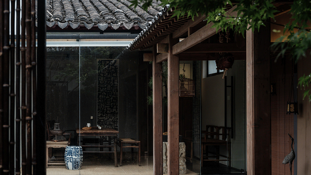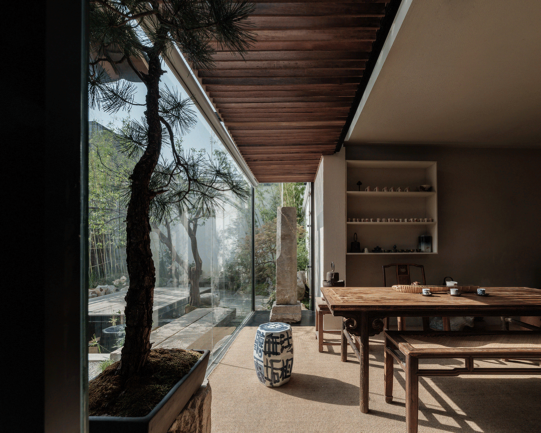 青砖黛瓦,雅致的建筑立面,大面积落地玻璃窗,模糊室内外空间,院里绿意透入室内,树影婆娑装点着所有空间。宅院内喝茶、读书、写作的神仙日子,尘嚣远离,诗意生活,信手拈来。