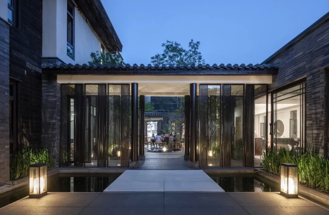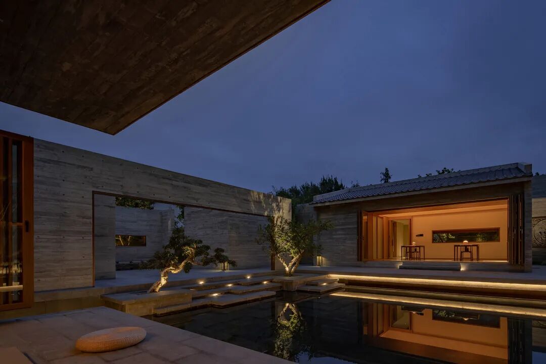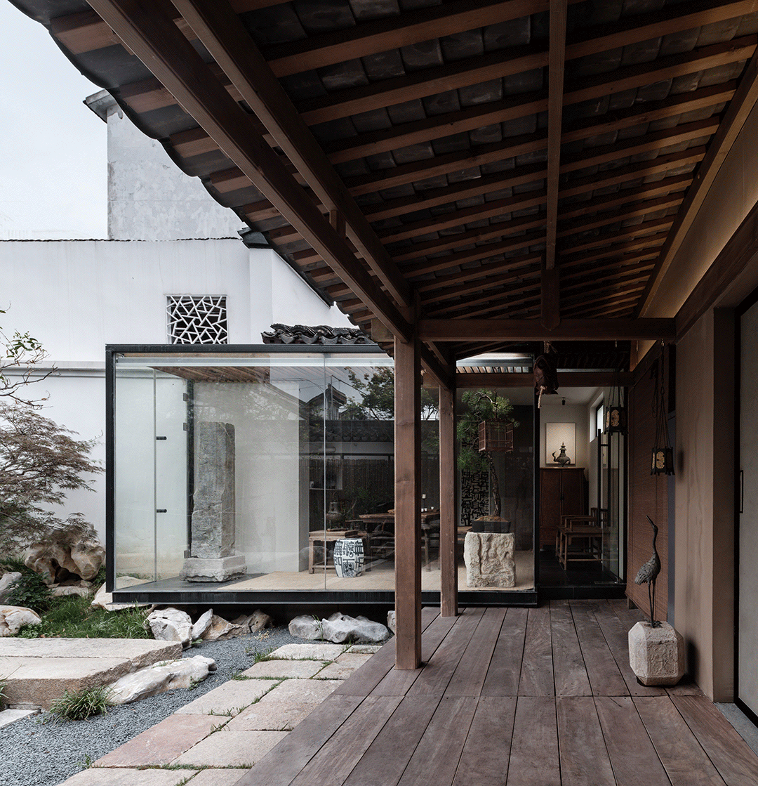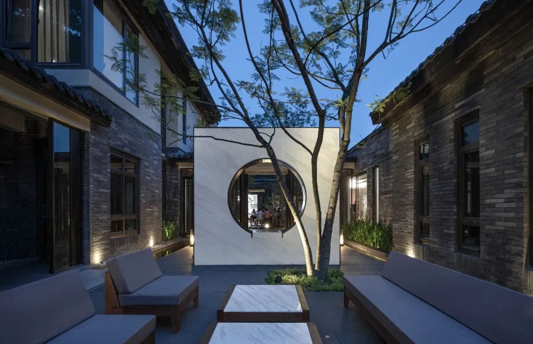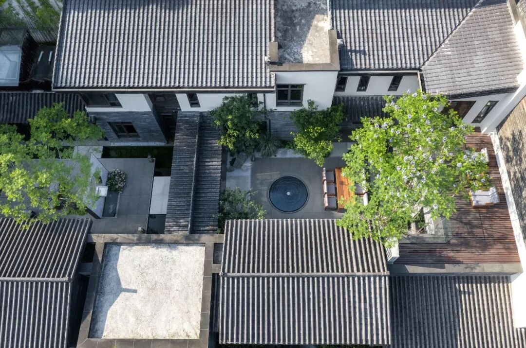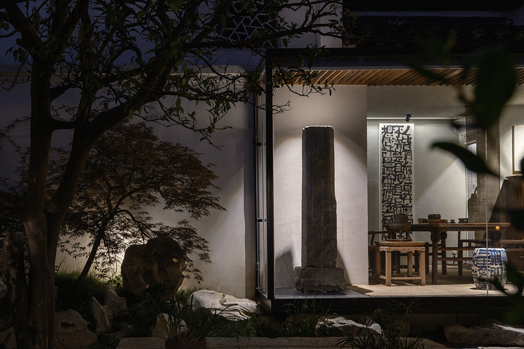 青砖黛瓦,雅致的建筑立面,大面积落地玻璃窗,模糊室内外空间,院里绿意透入室内,树影婆娑装点着所有空间。宅院内喝茶、读书、写作的神仙日子,尘嚣远离,诗意生活,信手拈来。