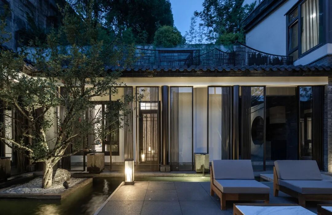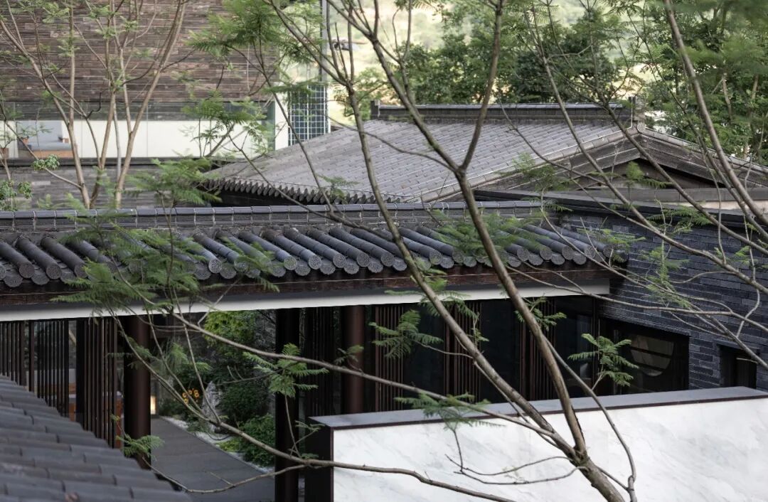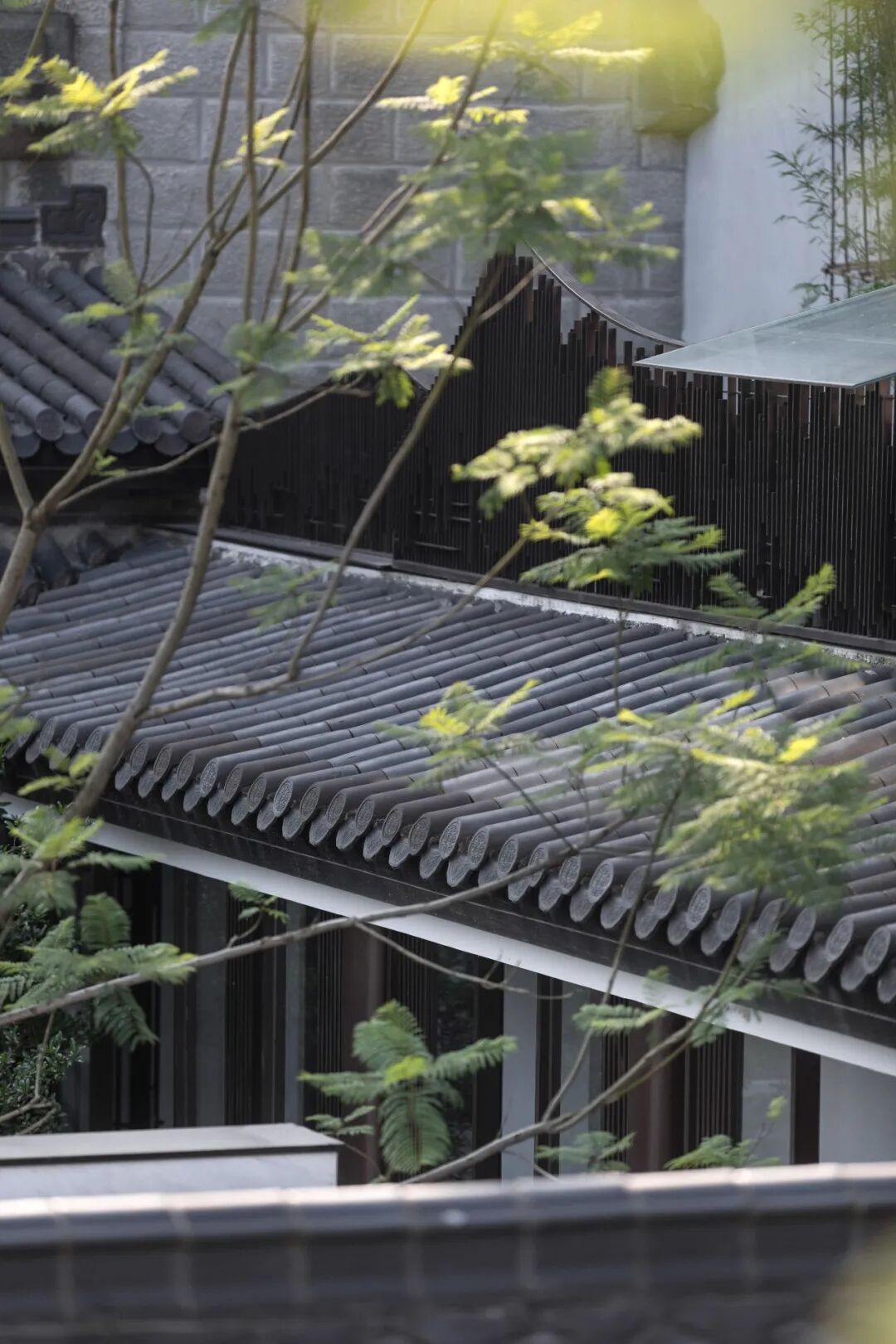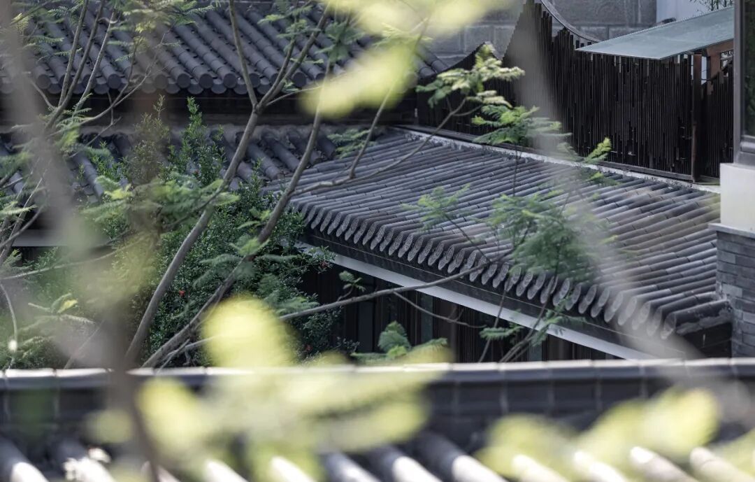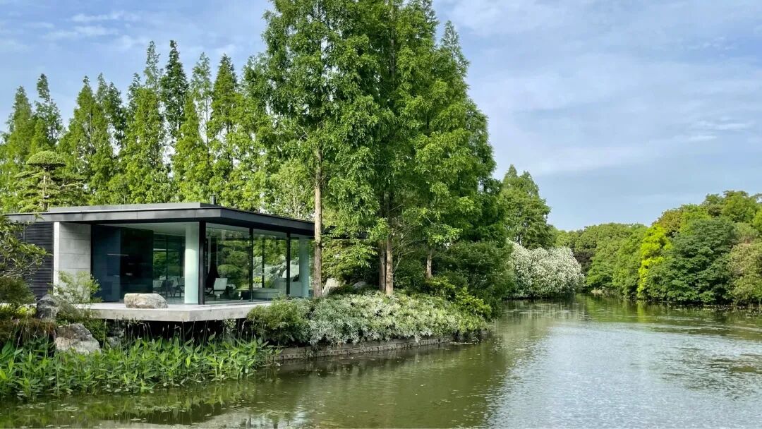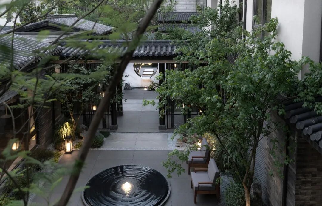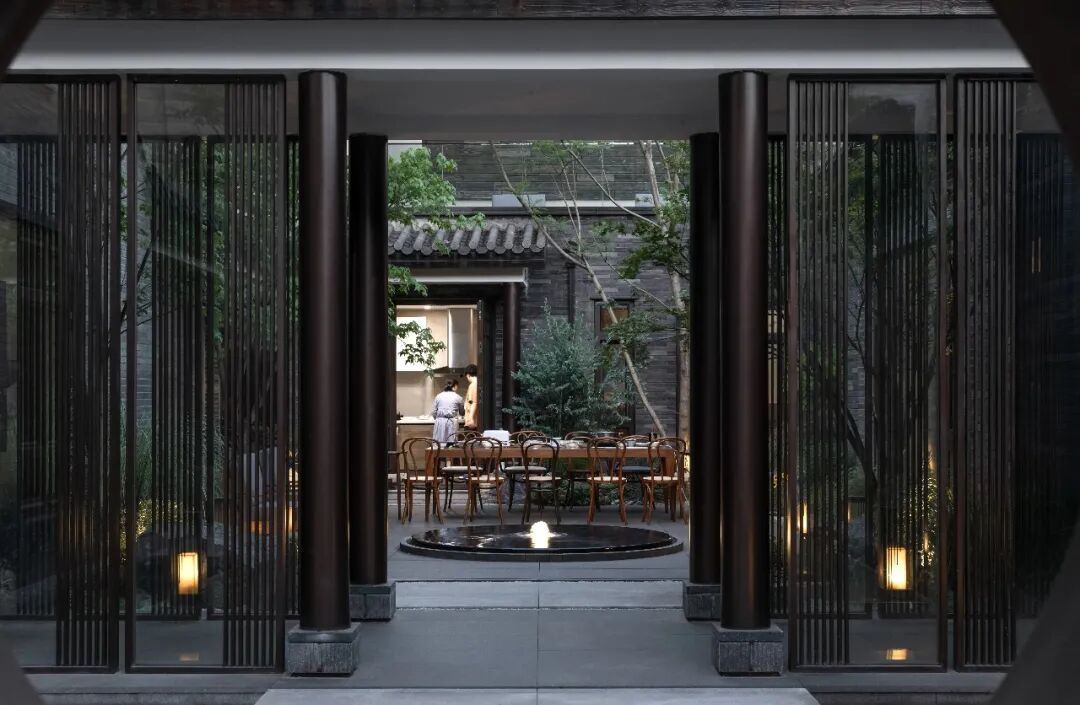 青砖黛瓦,雅致的建筑立面,大面积落地玻璃窗,模糊室内外空间,院里绿意透入室内,树影婆娑装点着所有空间。宅院内喝茶、读书、写作的神仙日子,尘嚣远离,诗意生活,信手拈来。