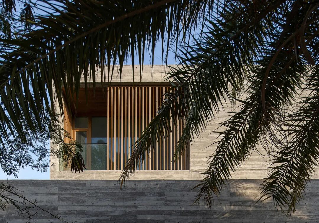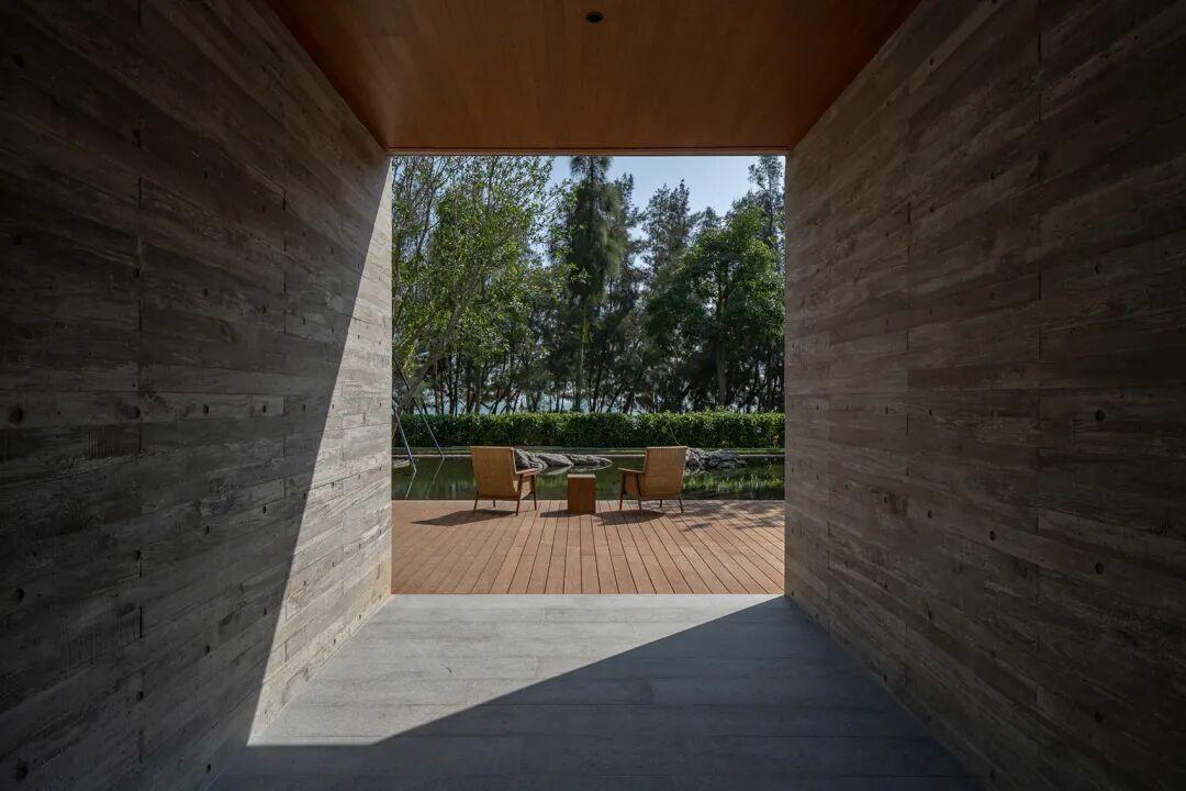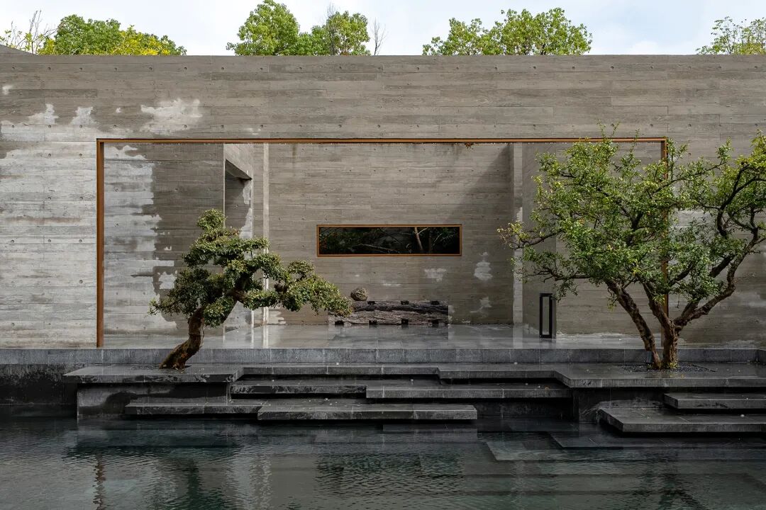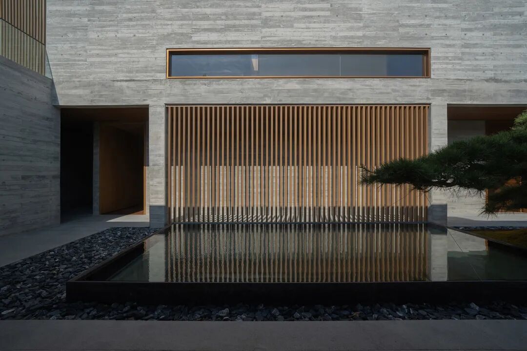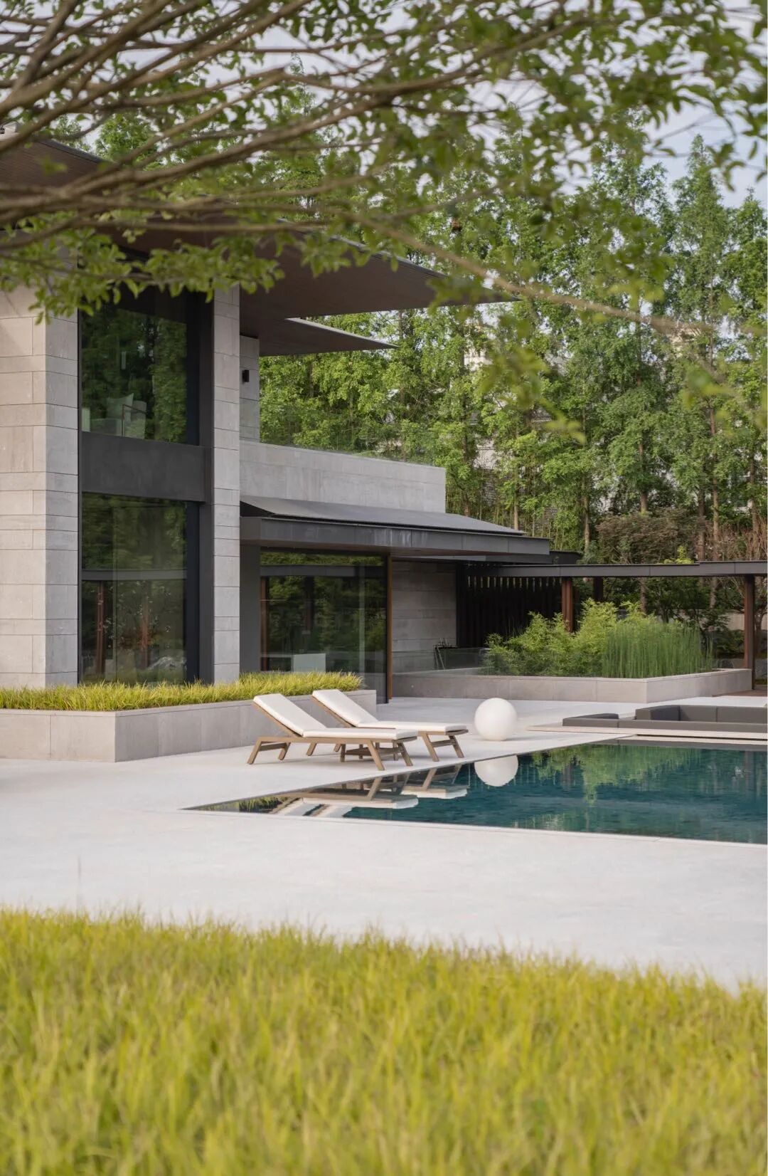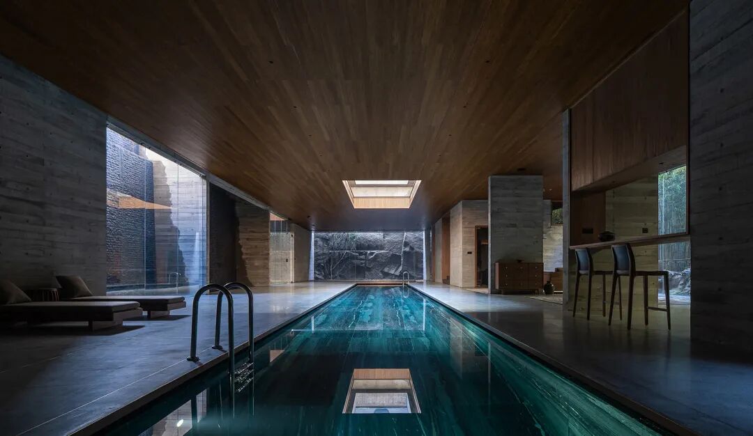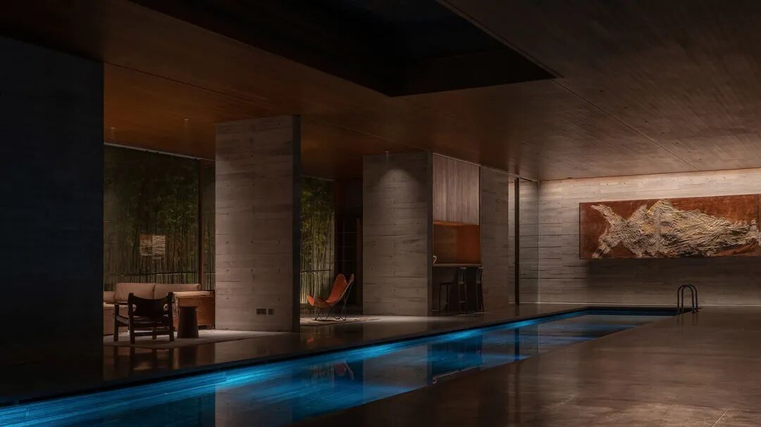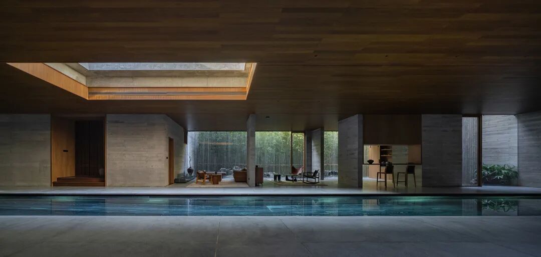 ‍对于项目的室内部分,就一组需长居久住的自用空间而言,过多保留清水墙面难免产生“冰凉”之感。于是我们与业主一道商议:采用分区域、有选择地在室内保留混凝土的原始质感。项目的休闲部分,在功能上有点类似“局部小公建”。我们就在像泳池这样的公共活动区域,留存了一定的清水墙不做额外修饰,但通过吊顶的竹木材料去平衡感官上的冷暖关系。