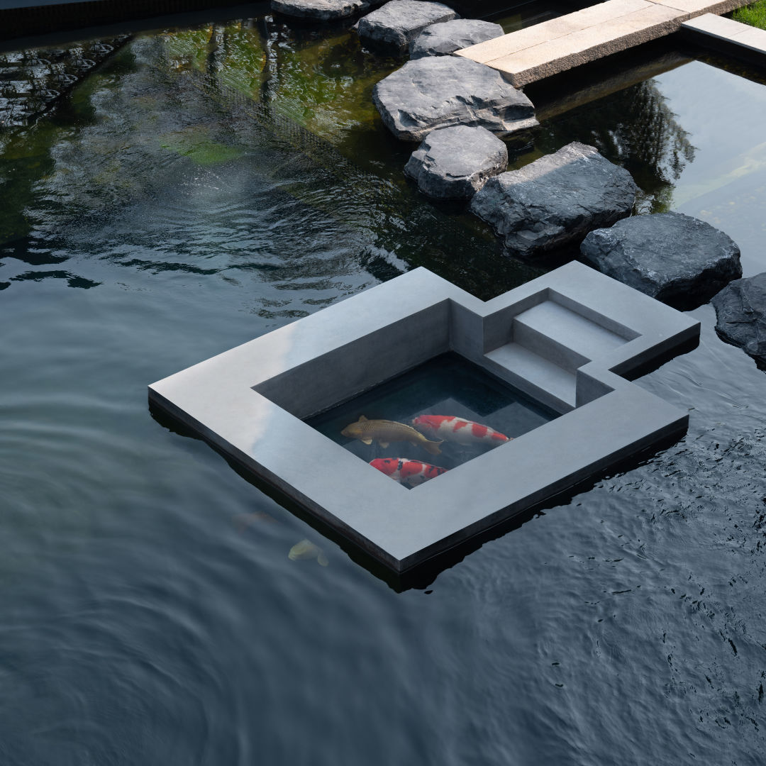 映舟是池潭之上的一处近水观鱼所在。整体如船形态没入水中,玻璃作船底。园主人落座其中,观脚下游鱼穿行嬉闹。