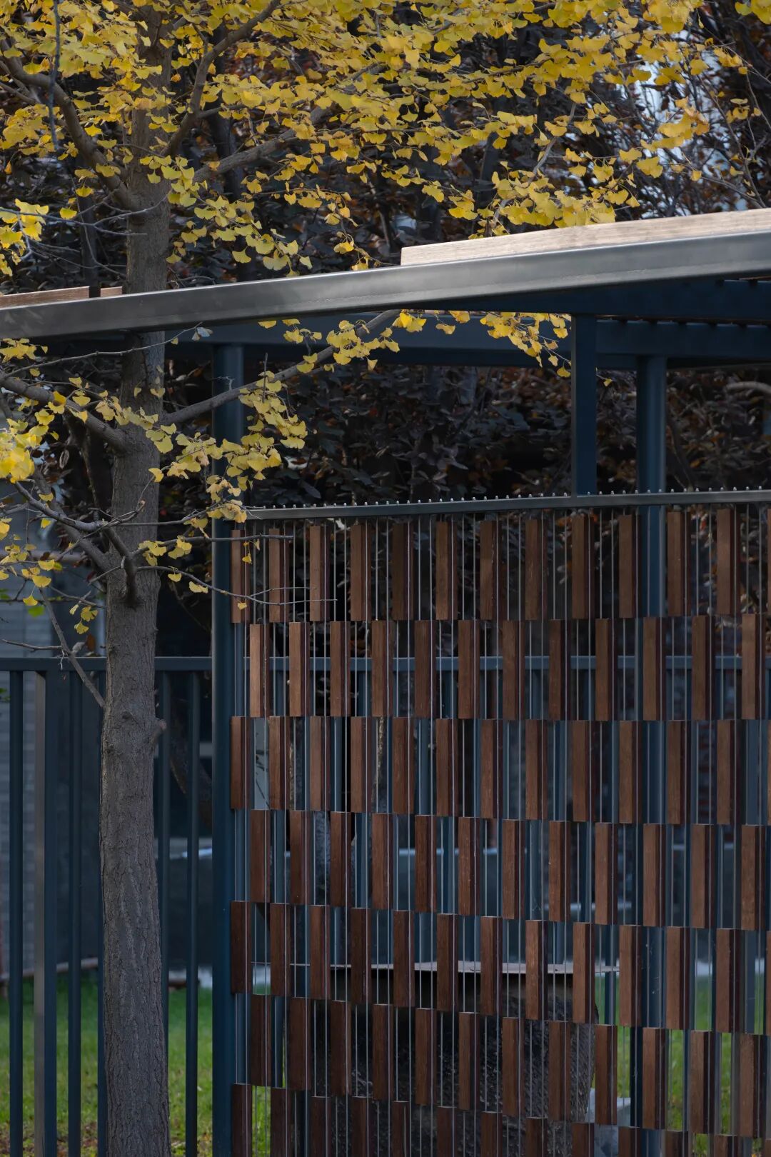 曲廊构造也为轻质钢结构,单面格栅墙向西围合,保证园子内向的私密性,同时也构建出东园的游园路径。连接着东园与南园各个节点,使其在庭院中动静观景皆为可能。