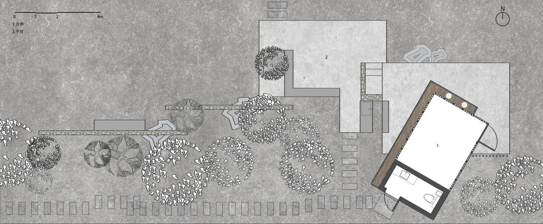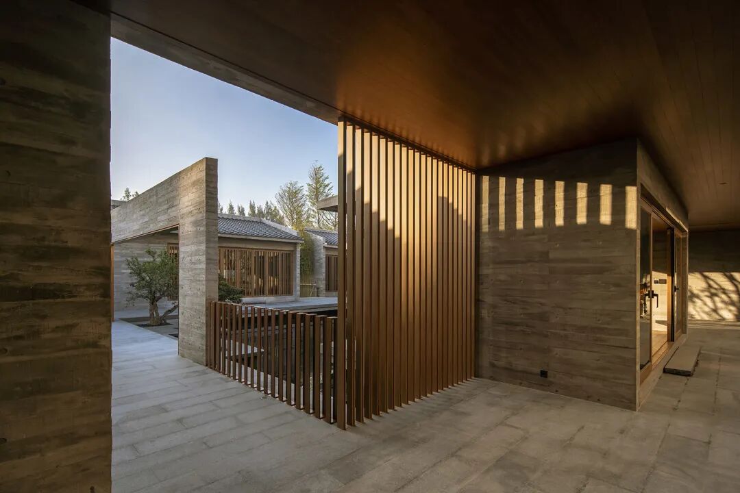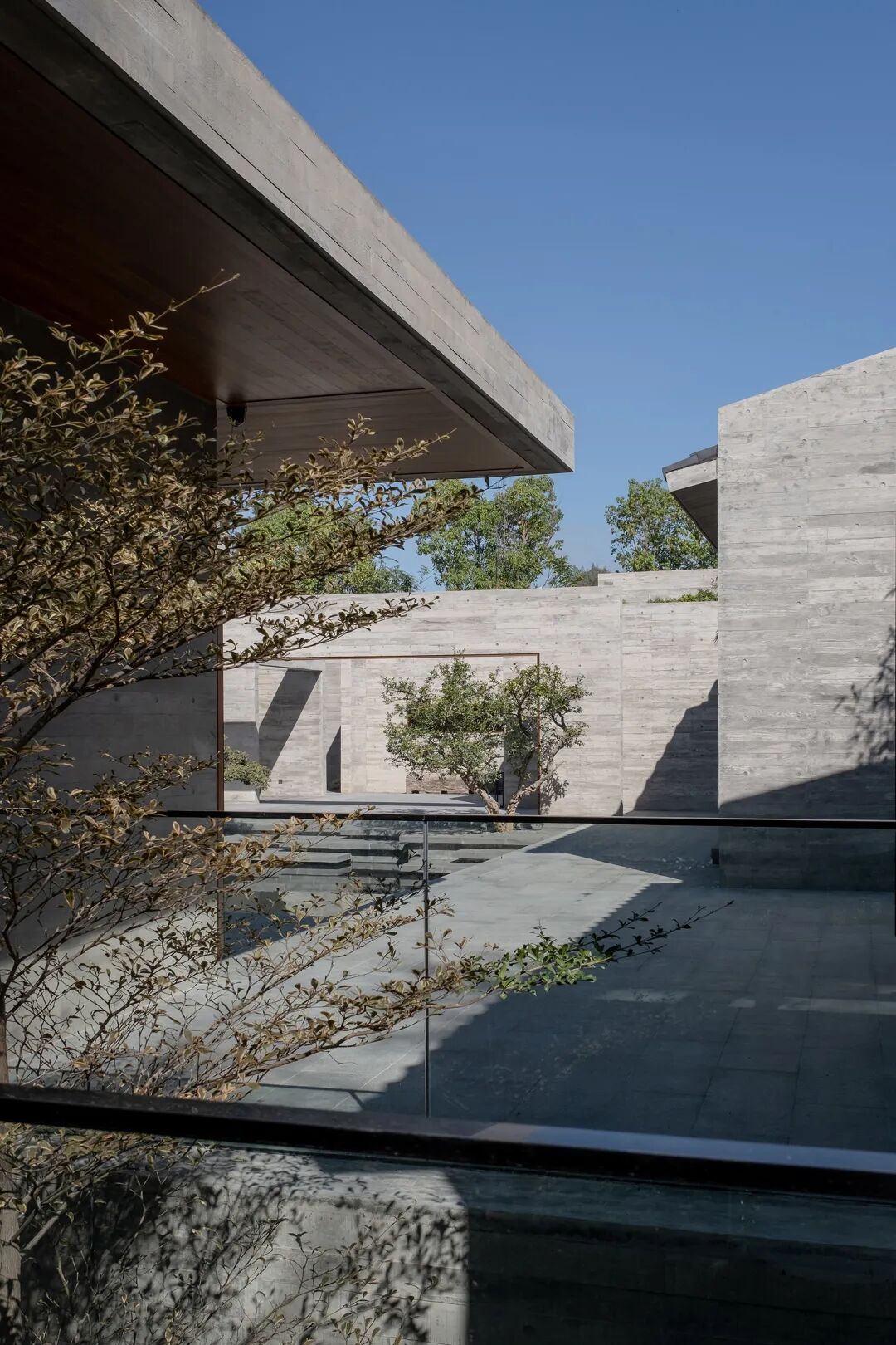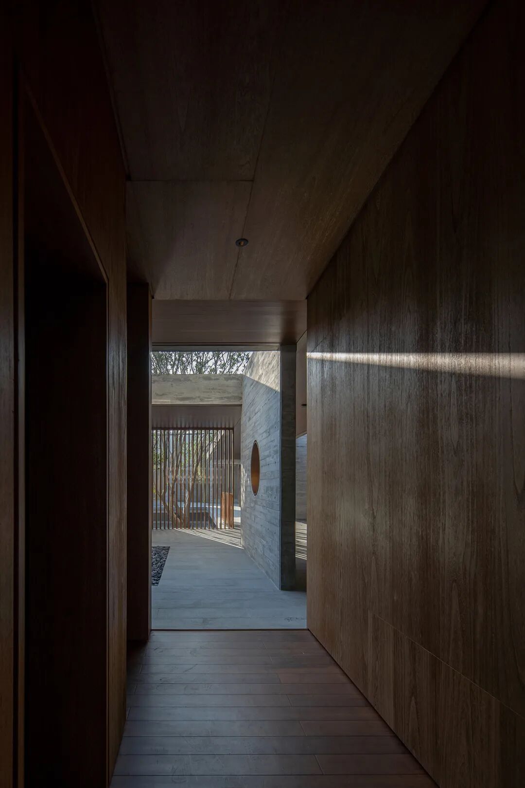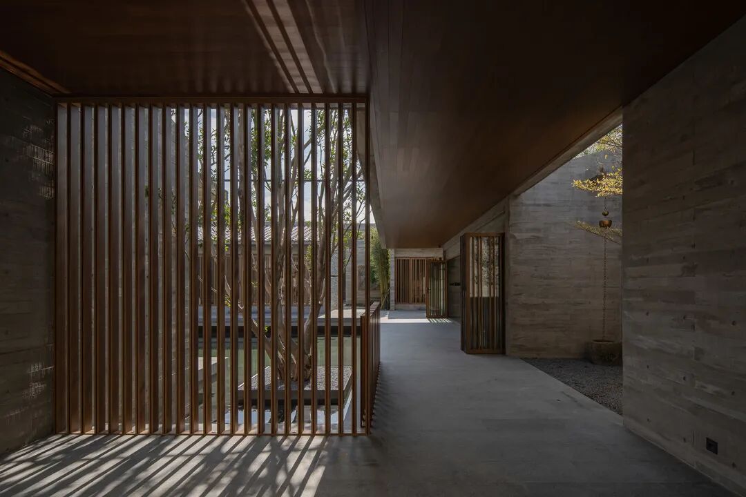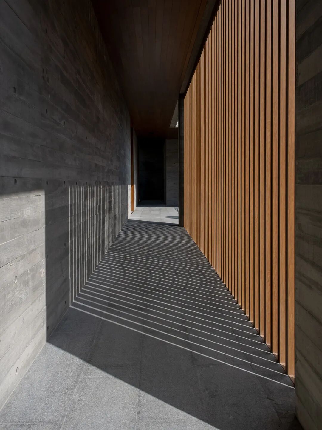 长镜头般的内部游线,是一条串联空间的时间线索,既模糊了各部分的边界,也让庭院流动了起来。由场地东北角入口处的几踏石阶拾级而上,檐下推门探身而入,游经入口空间、中央水院、带状庭院等一系列收与放的空间序列之后,穿越南侧建筑下的通道到达户外观景平台处,视野完全舒展开来。
