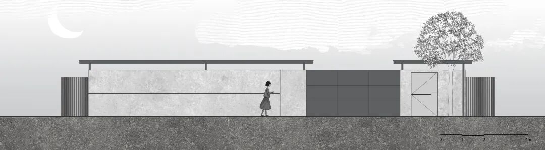 接着要解决的是落位关系。场地的出入口在北侧临路,于是设计先将场地一分为二,北侧归给公共休闲部分靠外,南侧划为私密居住区域靠内,两者之间拟造一处共享水院。再将居住部分亦对半切开成两套独立居住单元,切分得来的“负空间”区域,自然形成了两户之间的带状庭园。建筑群的地面部分,除南、北两侧布置二层体量外,均以单层展开,这样的空间尺度更贴合“园子”的主题。