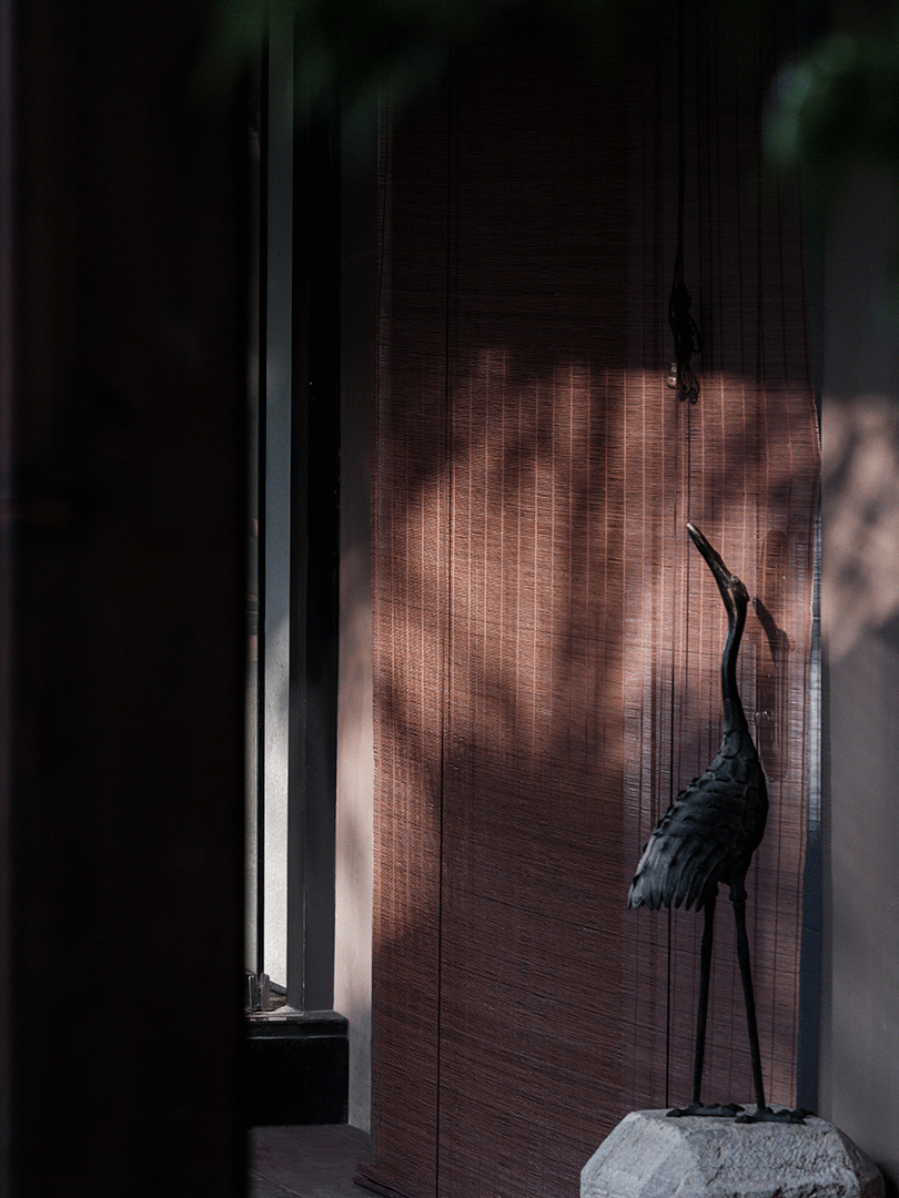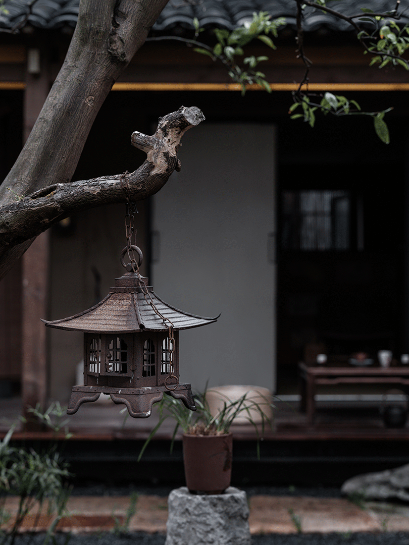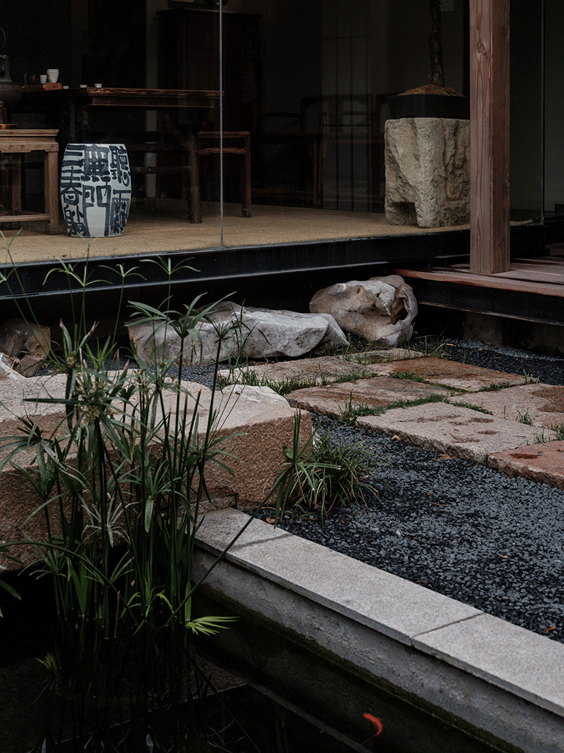 倾心庭院之美,落于细节处,往往也是“最寻常处”,入口放置一口老缸,朴拙,平凡,却藏一方山水,合文士雅趣;