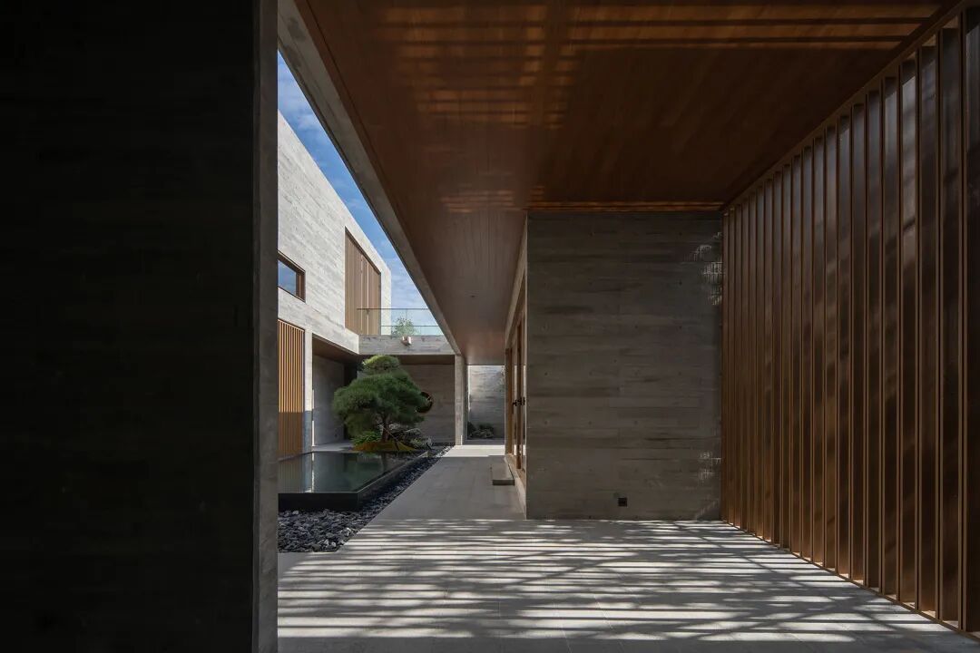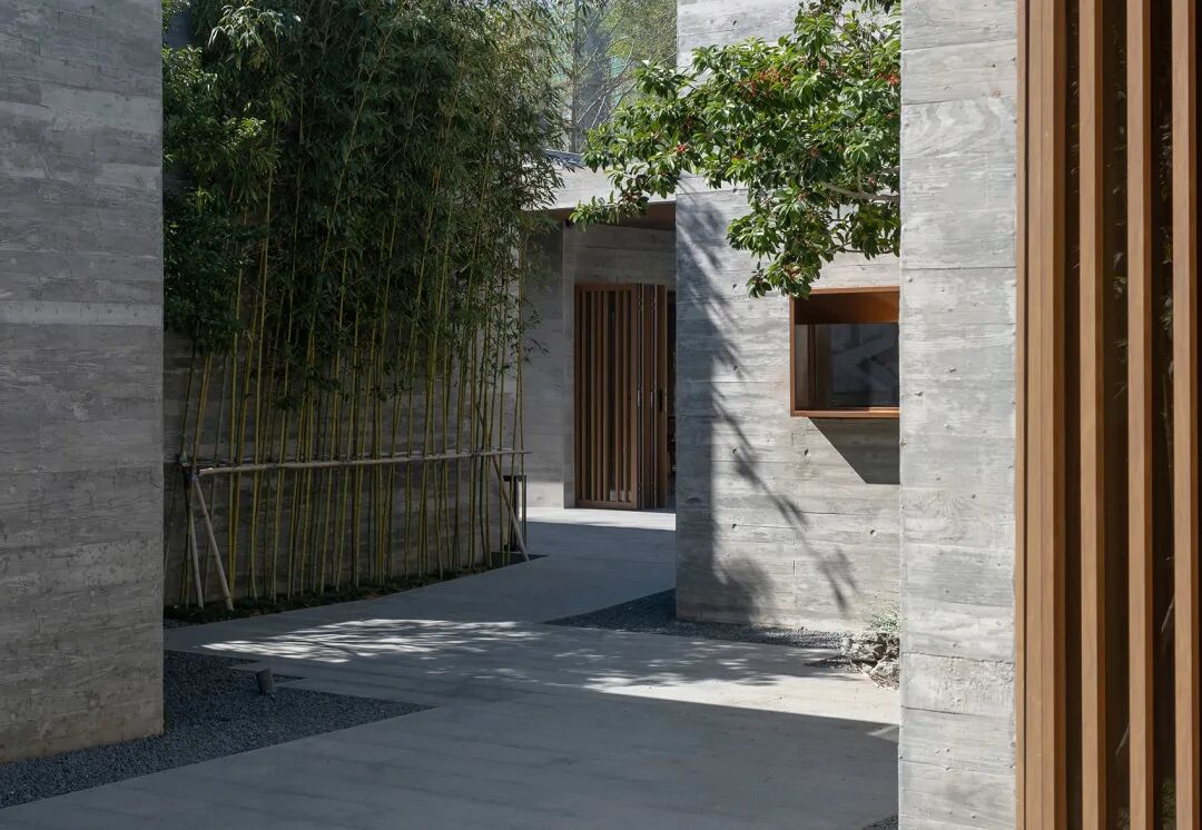“清水园”名字的由来与材料本身多少有些关联。将剪力墙作为结构体系,并采用清水混凝土作为建筑主体材料的原因顺理成章:业主有自己经营多年的混凝土生产企业,对此材料很熟识。墙体的浇筑采用了纹理自然的松木小模板,水平走向的木纹也更适应小尺度空间的横向流动感。在一些需要稍加变化的空间部位,也少量使用了毛竹模板。对于房子的辅材,设计则使用了户外瓷态竹板、黄铜构件、木色门窗及格栅系统等暖色系材料,以平衡与清水混凝土间的冷暖、软硬关系。