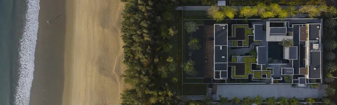 “清水园”的设计和建造过程,也历经了五年时间。房子的主人是一对企业家兄弟,于早年拍地摘下了这块约3亩的住宅用地。基地呈长方形,短边南北方位,北临路南近海,东西两侧相邻地块有些现状建筑。用地与海滩间密植了30米宽的木麻黄市政防风林带,阻隔了场地直接观海的视野,但亦屏蔽了台风的不利影响。