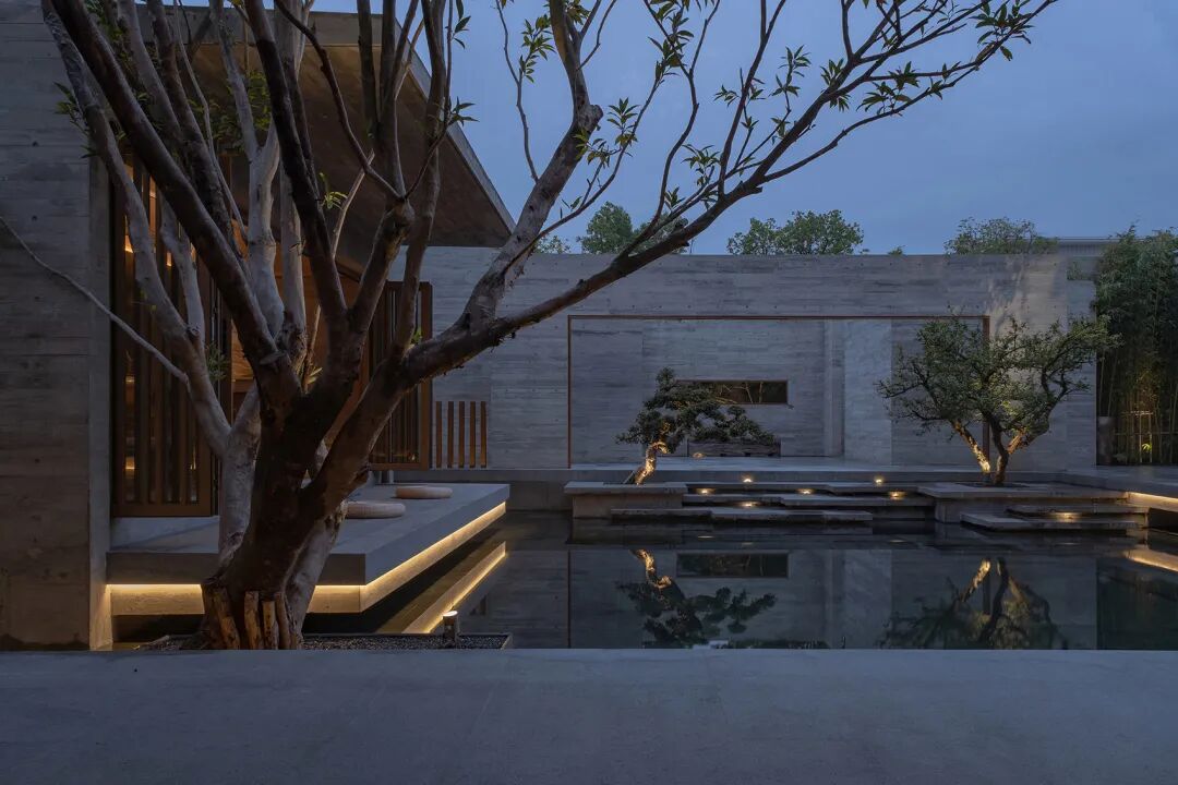 院子后山便是涂山寺,晨钟暮鼓,禅林相伴。在禅宗精神的触发下,我们以追求一种空灵简朴意境的松弛空间,利用自然环境的舒朗与院内静谧,将“入定”放在环境与建筑的平衡上,呈现一种自然之感。