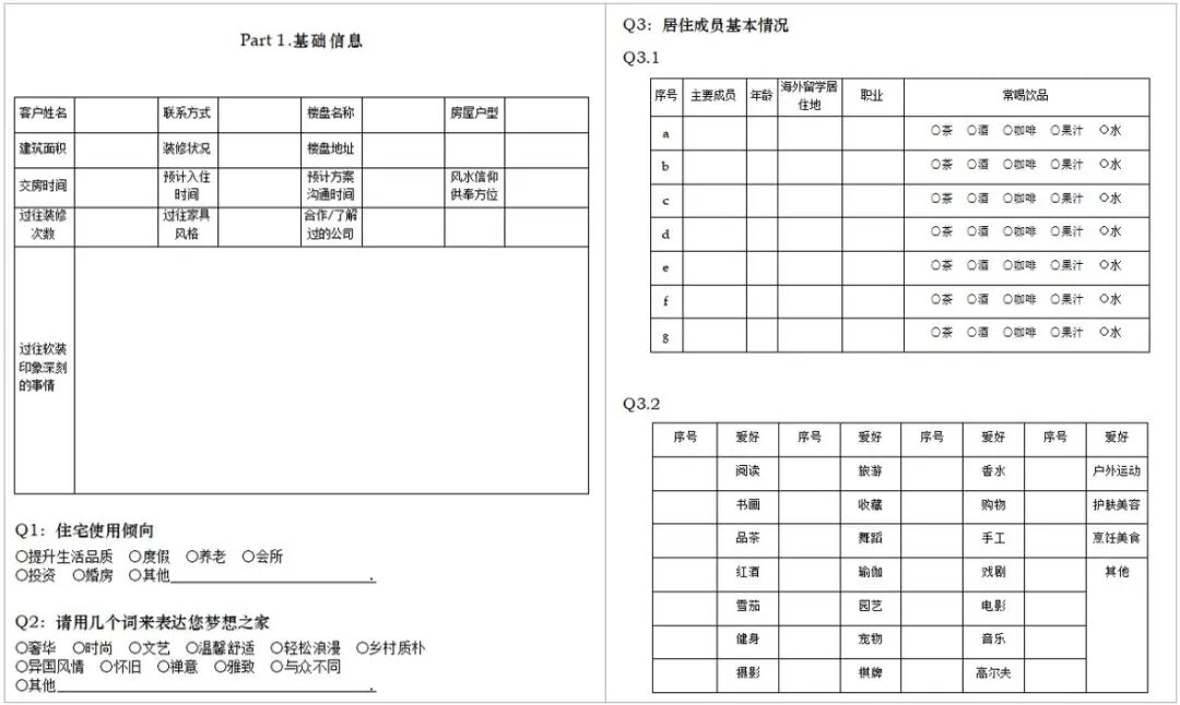 最好最高效的方式是把住宅客户的问题提前设想好,从基础需求,空间需求,功能需求,设备系统等;归纳成表格,提高沟通效率及沟通质量!