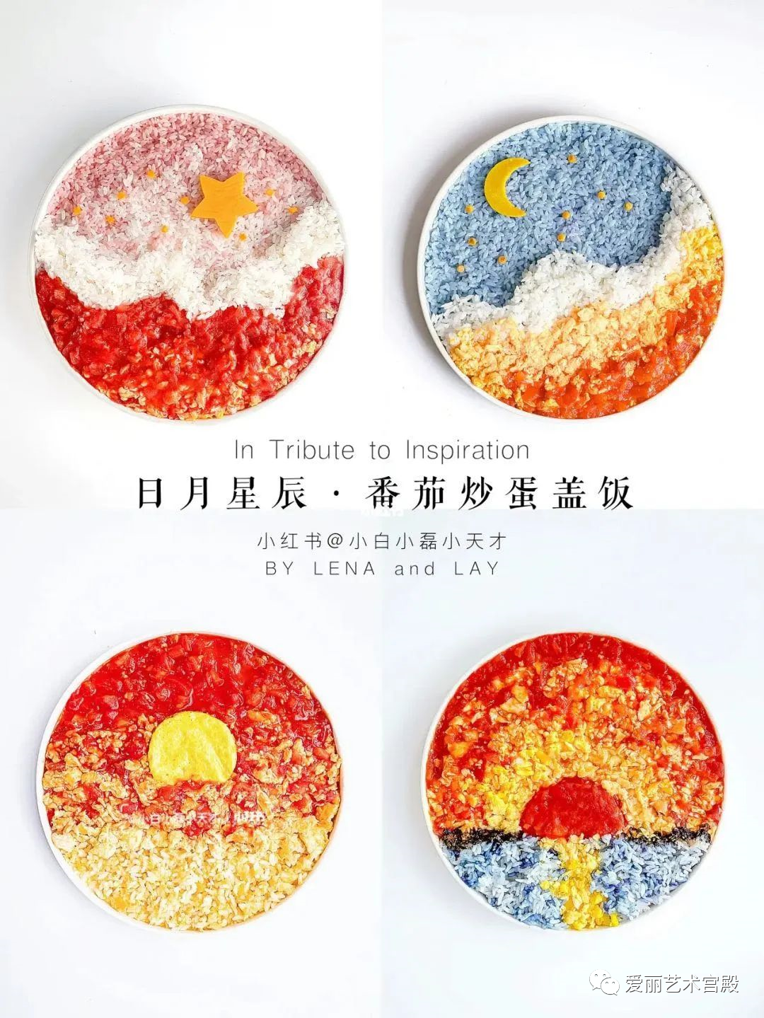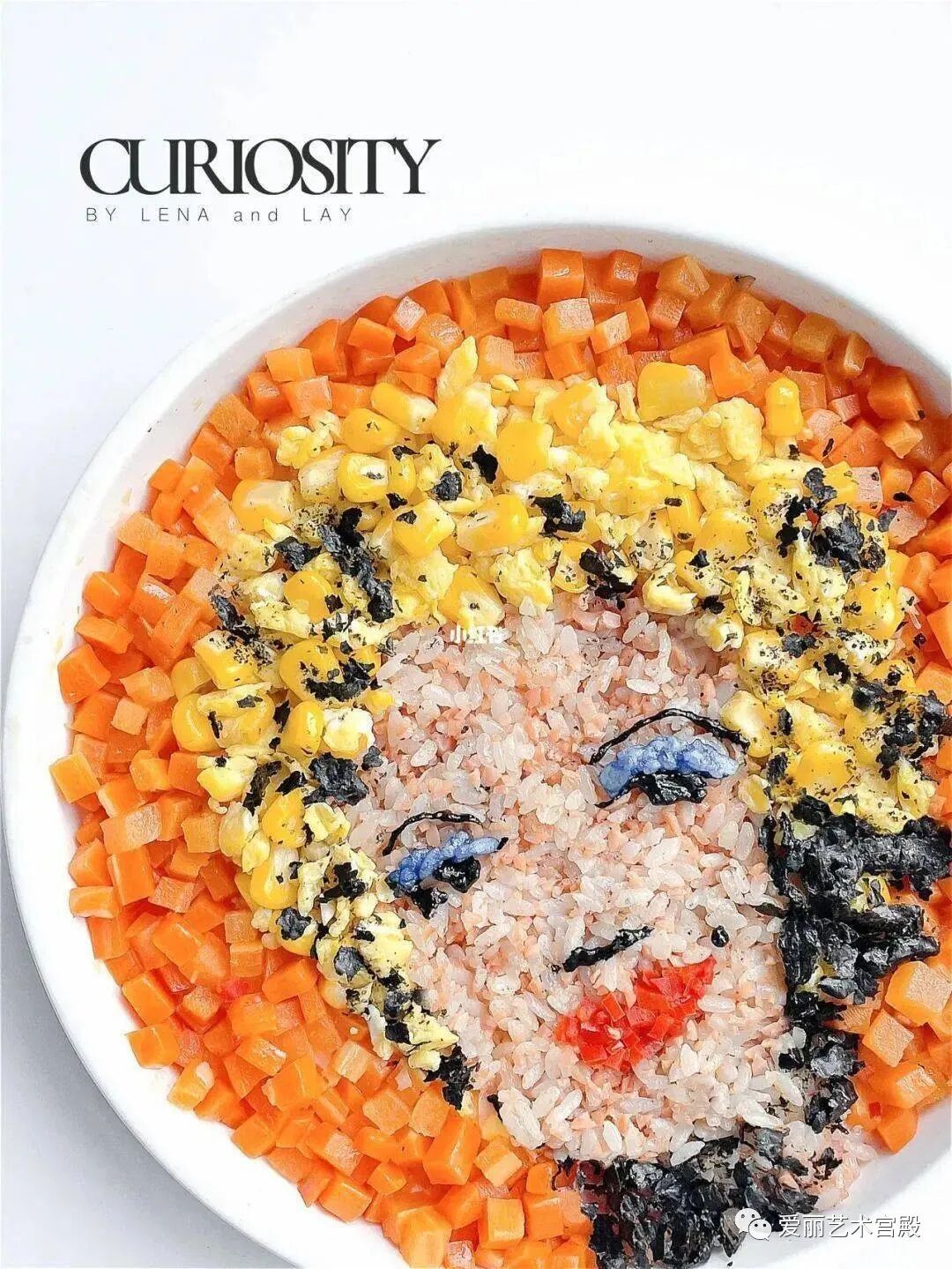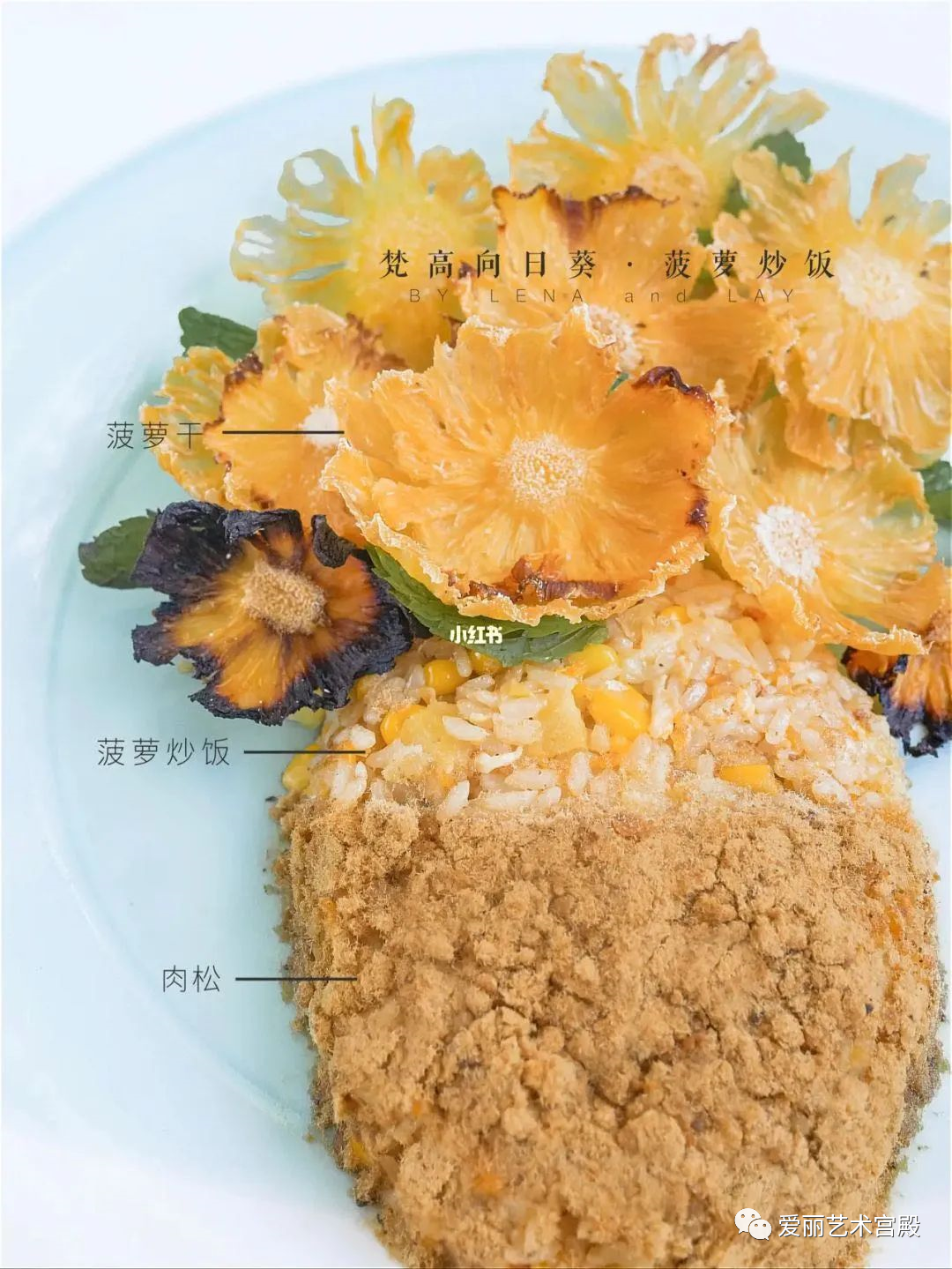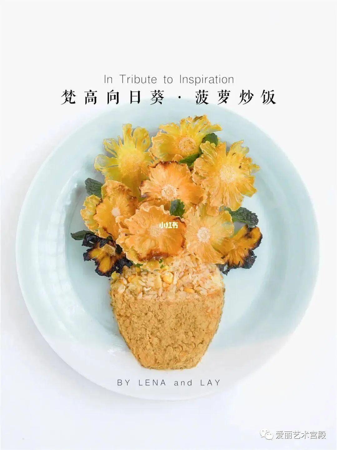 除了她丰富的想象力,注重细节也让她能进行更多的创作。比如在烘烤菠萝片时,她发现菠萝片的边缘会卷曲,很像向日葵的花瓣,恰好很像梵高笔下的向日葵,于是,用菠萝炒饭摆成花瓶,用菠萝片制成花瓣,这幅名画就“烹饪”完成了。