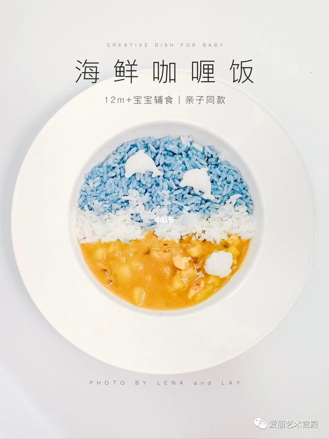 “米饭或许也能这么做,咖喱煮好摆进去,白米饭铺一半,再拌个蓝色米饭铺另一半,压两个海豚放上去,最后竟然只花了半个小时。”难度虽然远不及最近的作品,但从这份海鲜饭开始,“美食艺术家”正式上线!
