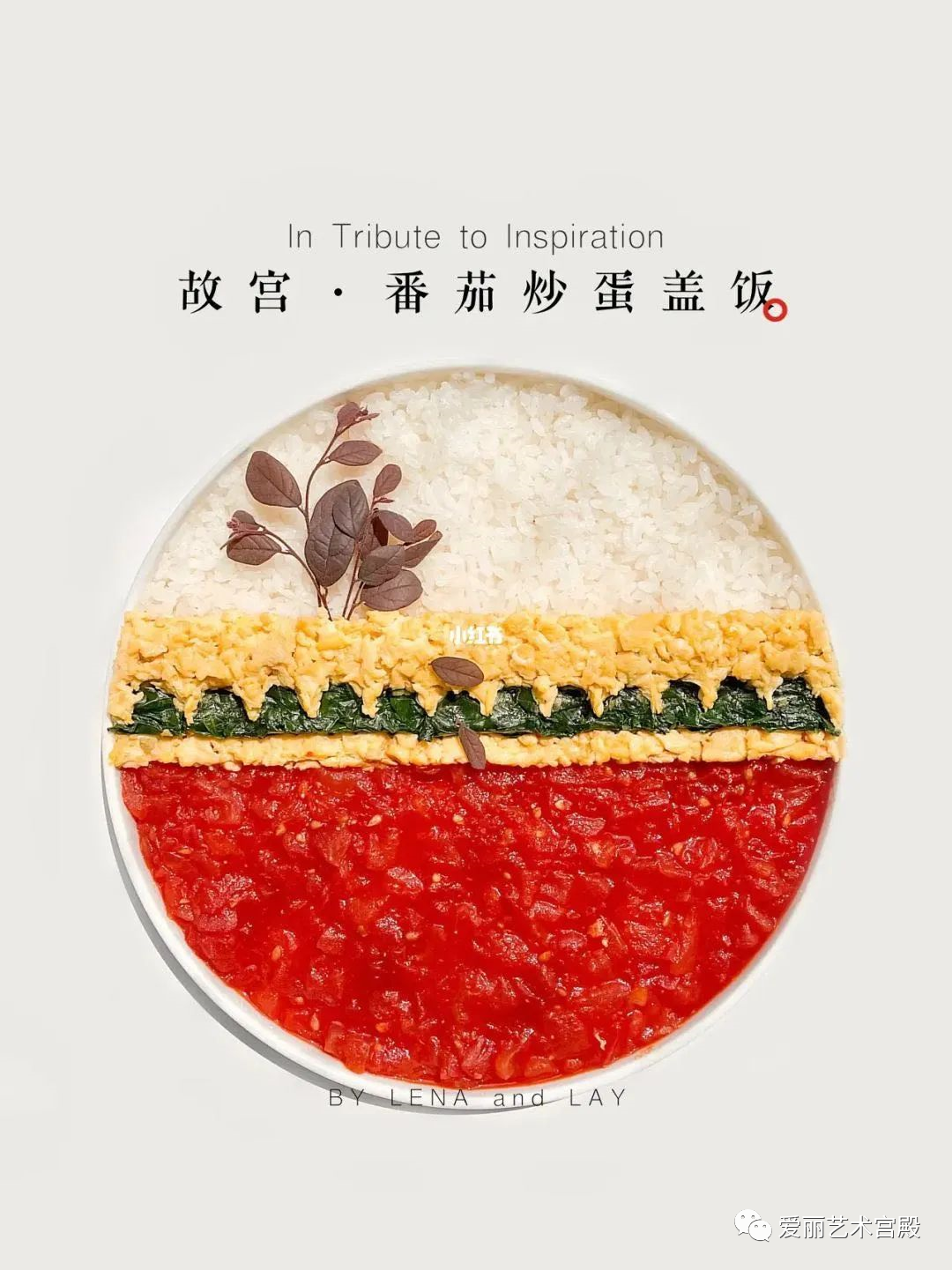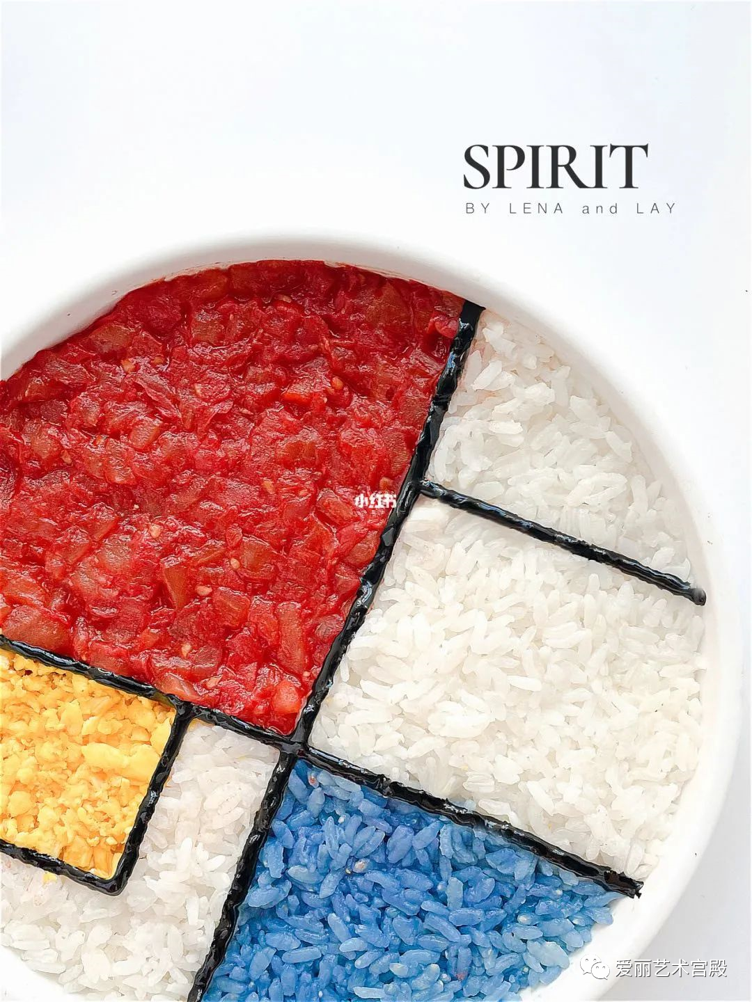 甚至就连家里最平凡的番茄炒蛋,也在蒙德里安的抽象画中,焕发了“第二春”。“某天看着切好的番茄,打散的蛋,我眼睛里闪现的,全都是蒙德里安的《红黄蓝的构成》,艺术版番茄盖饭就这么诞生了。”