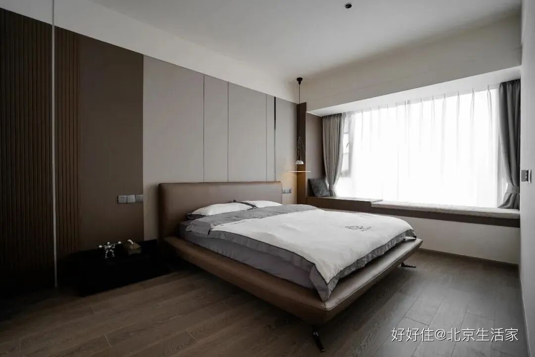 北京生活家:赵小姐平时在职场雷厉风行,但是回到家,也需要一个舒适的环境休息,回归最真实的自己。步入卧室就让人心生平静,没有张扬的颜色,也没有繁杂的装饰,整体显得深邃又静谧,天气晴朗的时候,阳光会清洒入室,在飘窗上盘腿而坐,欣赏窗外的好景色,享受属于自己的时光。
